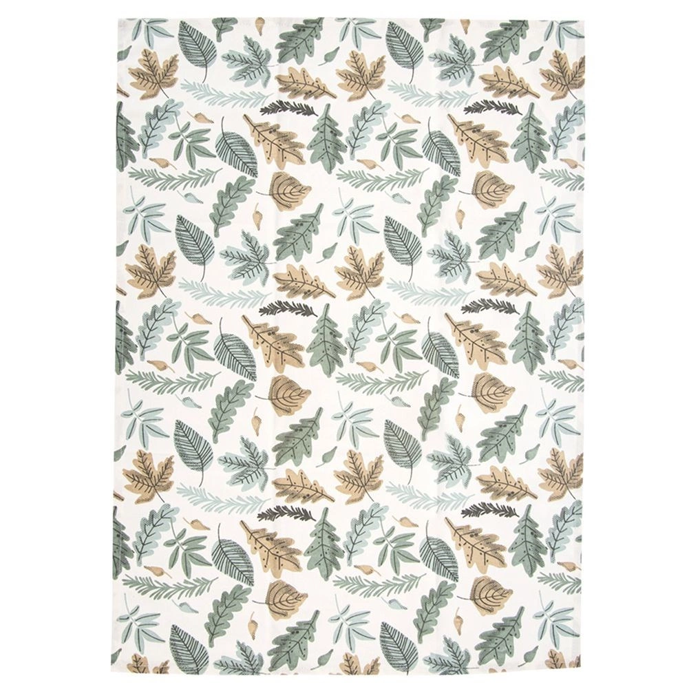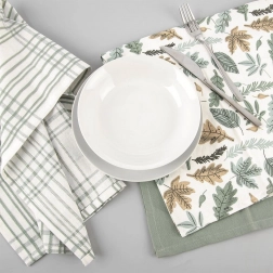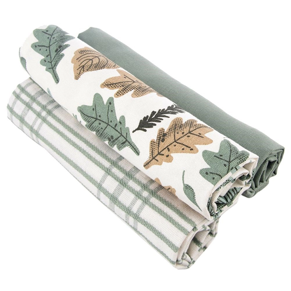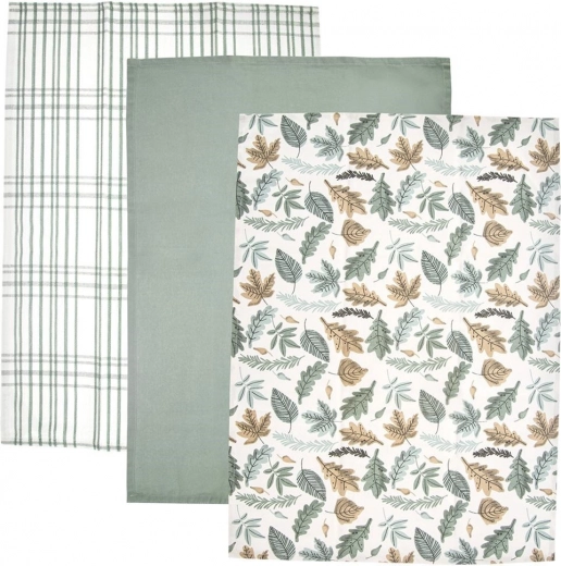Kombinacja motywu liści, zielonej kratki i jednolitej ściereczki nadaje kuchni naturalny charakter i łatwo łączy się z dodatkami.