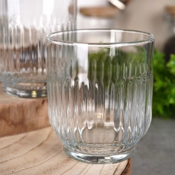 Pionowy relief nadaje szklankom elegancki wygląd, a jednocześnie zapewnia pewny uchwyt nawet przy zimnych napojach z kondensacją.