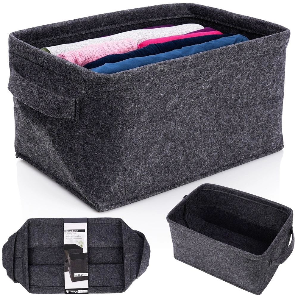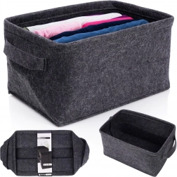 Ten składany filcowy kosz o wymiarach 36 × 27 × 20 cm to świetny wybór do przejrzystego przechowywania tekstyliów, zabawek, akcesoriów oraz artykułów biurowych. Dzięki mocnej i grubej tkaninie filcowej zachowuje kształt, a jednocześnie jest lekki i łatwy do przenoszenia.