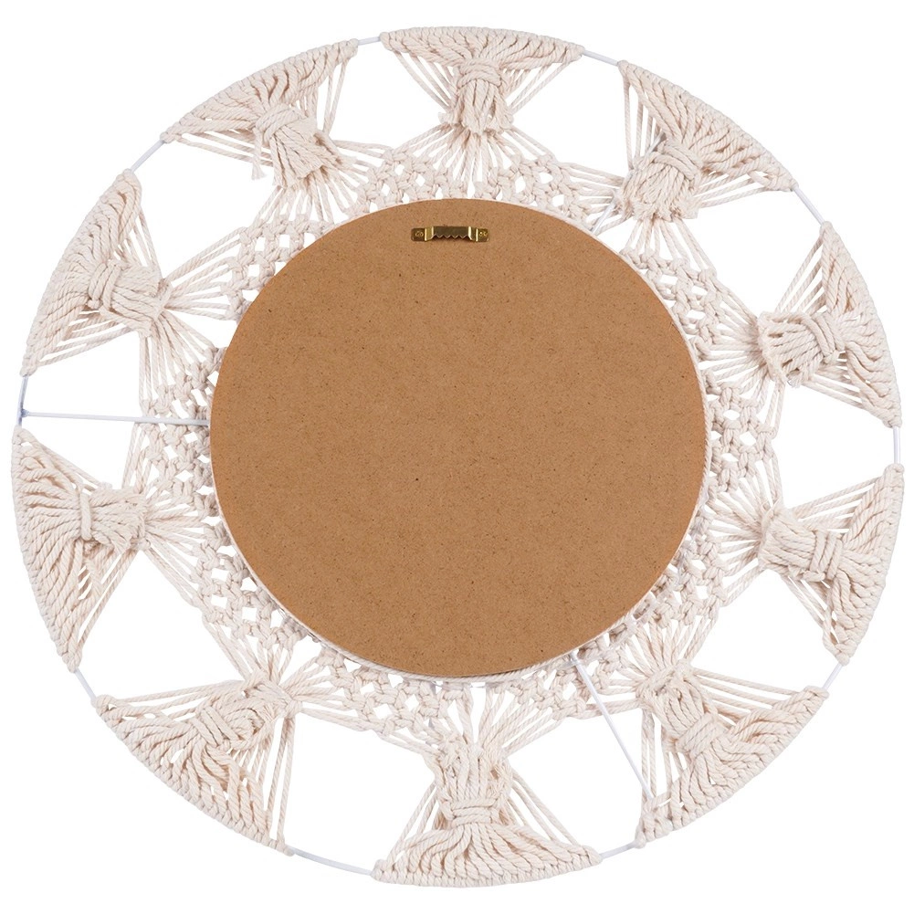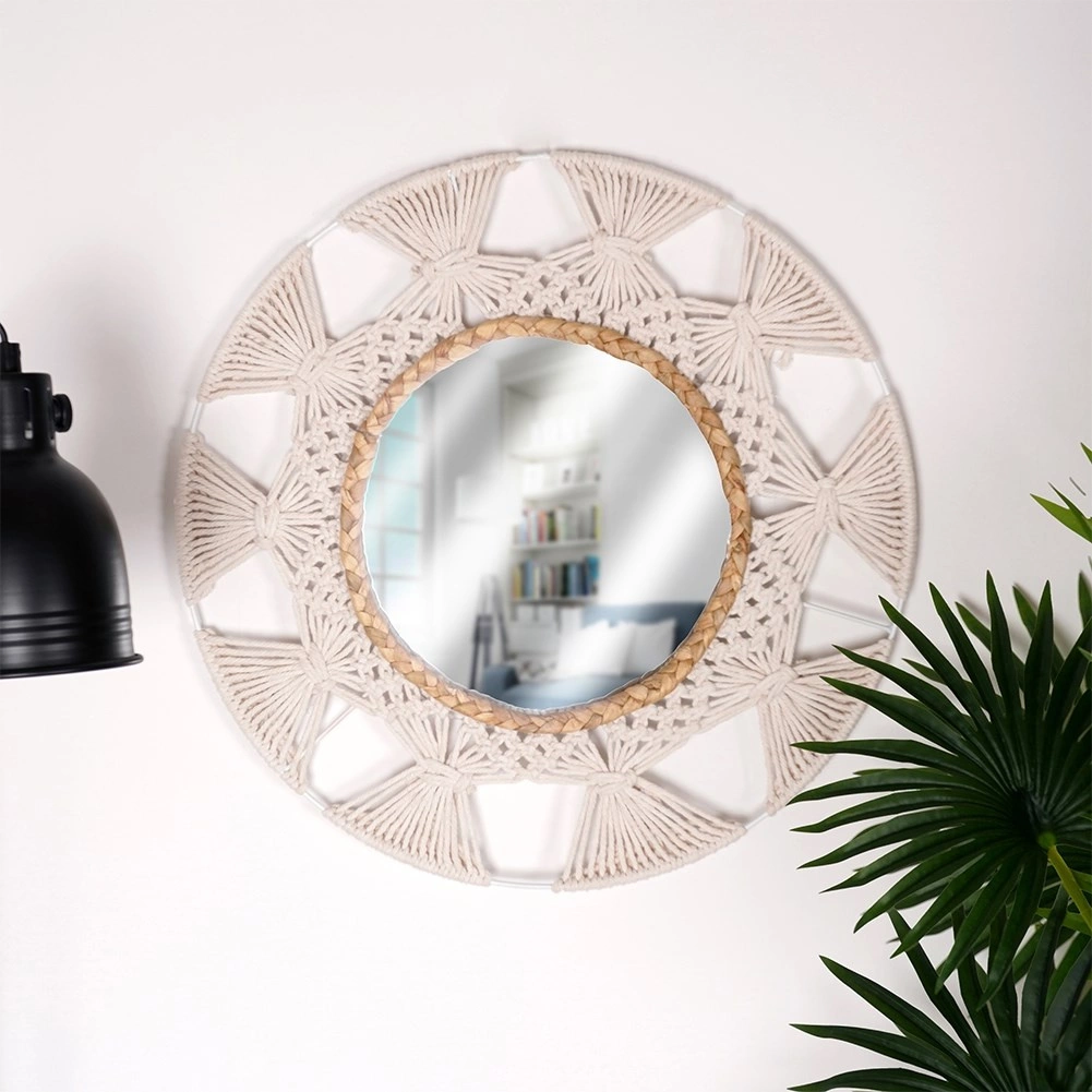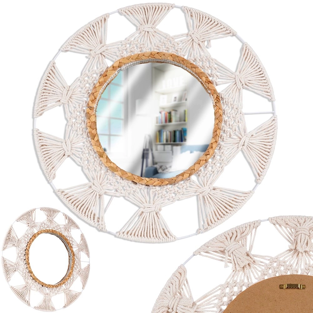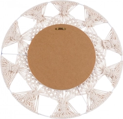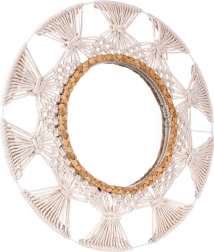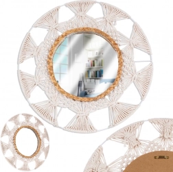 Wprowadź do wnętrza lekkość i przytulność dzięki okrągłemu lustru w popularnym stylu boho. Połączenie beżowego bawełnianego wyplotu przypominającego makramę oraz dekoracyjnego pierścienia z trawy morskiej tworzy wyjątkowy akcent na ścianie. Lustro zapewnia ostry i naturalny obraz i pełni funkcję zarówno praktycznej, jak i dekoracyjnej, wyrazistej ozdoby.