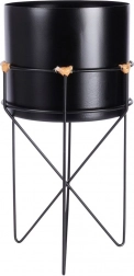 Wymiary: osłonka 17 × 31,5 cm (łącznie ze stojakiem), pojemnik 15 × 13 cm; odpowiednia dla wewnętrznej doniczki o maks. średnicy 14,5 cm. Matowa czarna powłoka oraz subtelne detale dekoracyjne są ponadczasowe i łatwe do łączenia z innymi dodatkami.