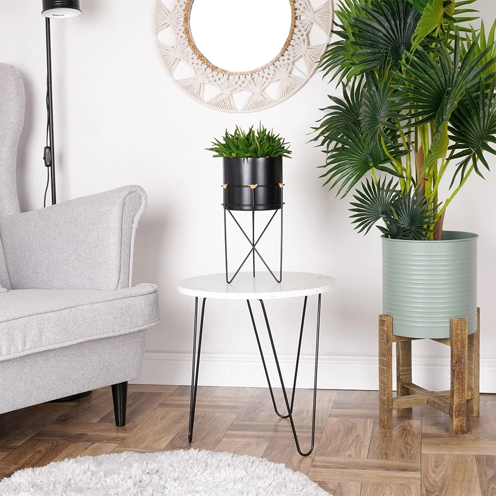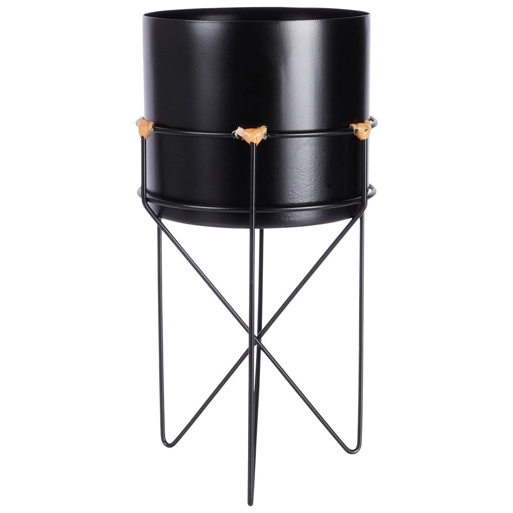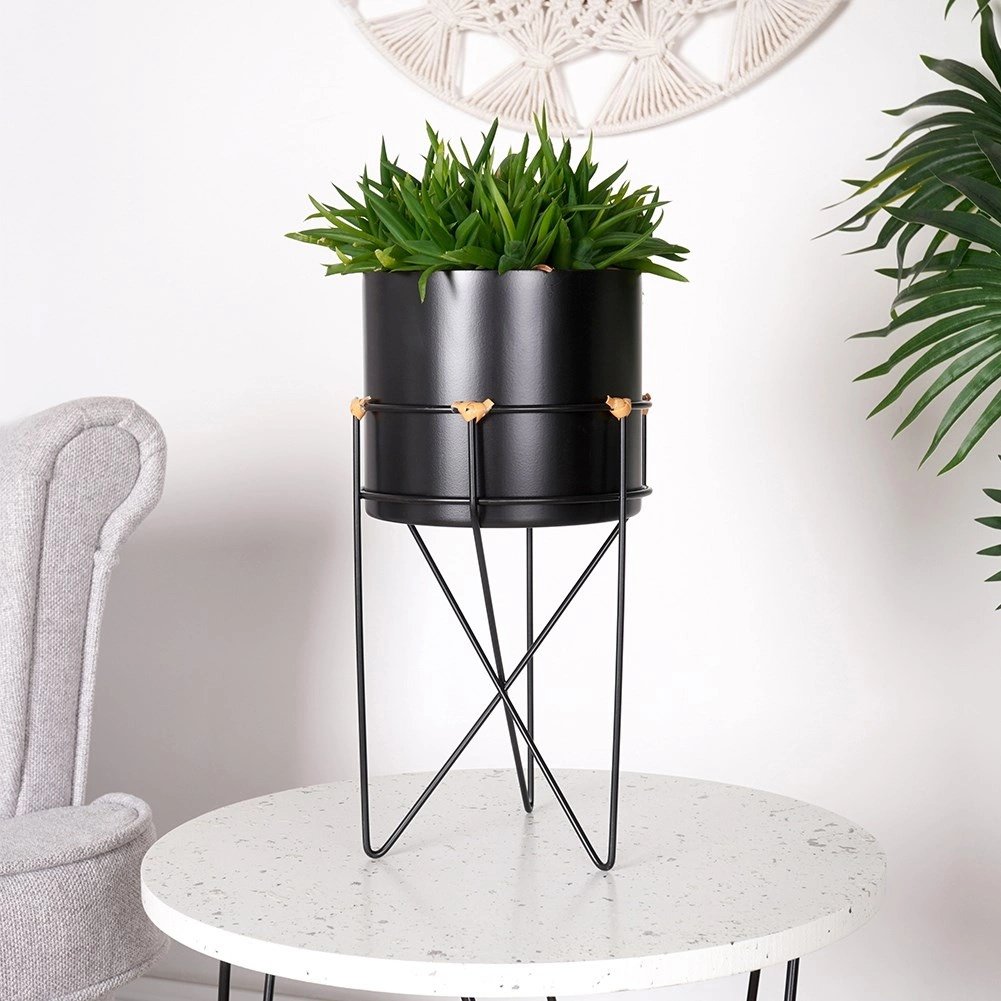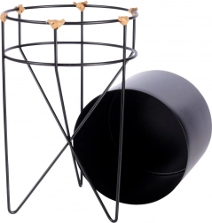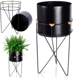 Designerska czarna osłonka z drucianym stojakiem świetnie prezentuje się zarówno w nowoczesnych, jak i klasycznych wnętrzach. Metalową osłonkę można łatwo wyjąć ze stojaka i przenosić. Dzięki podwyższeniu rośliny lepiej się eksponują i zyskują naturalną cyrkulację powietrza.
