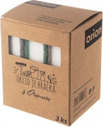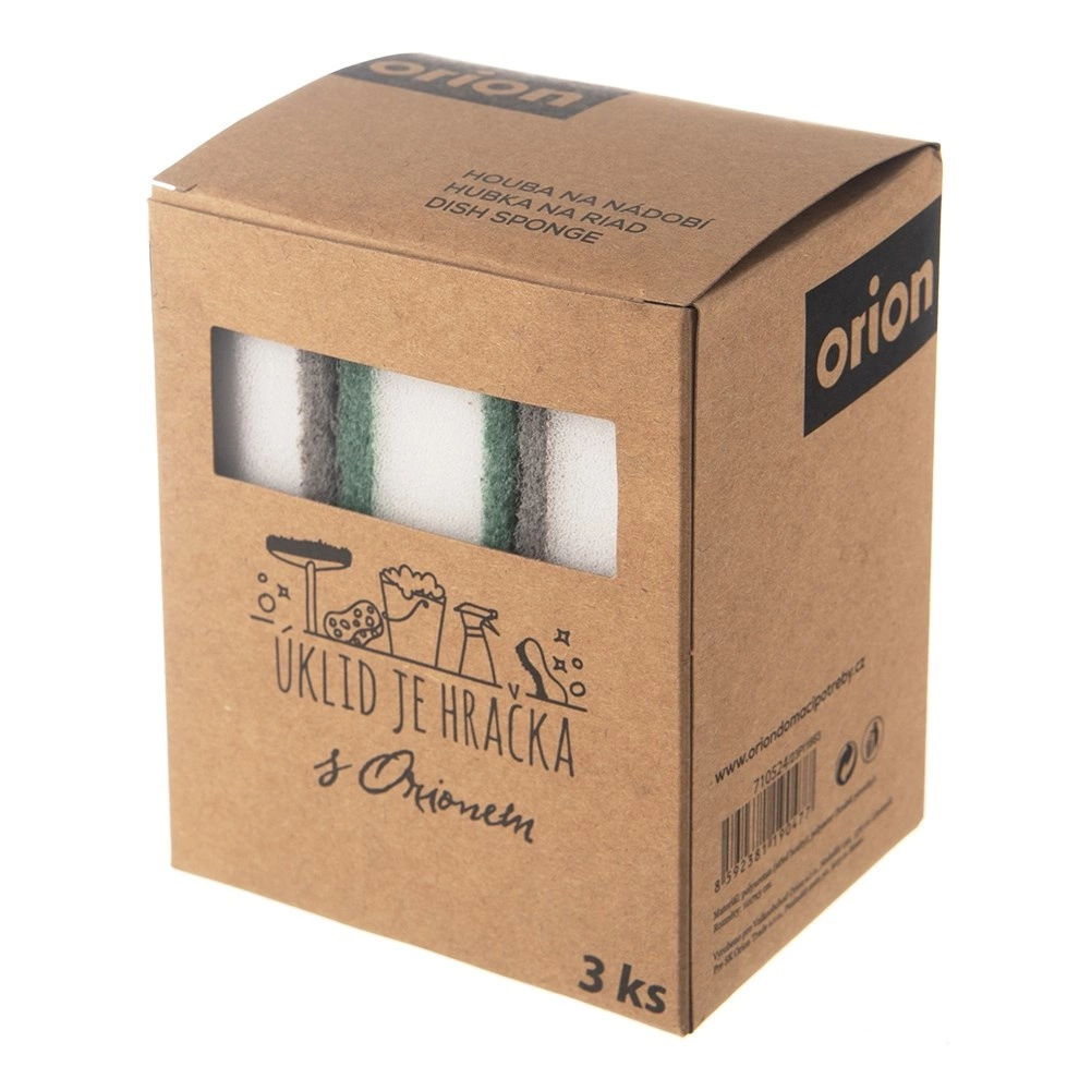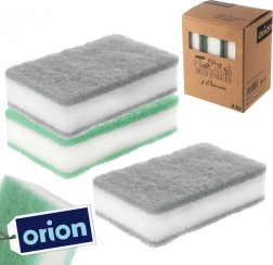 Trójwarstwowe gąbki kuchenne łączą miękką piankę z solidną warstwą ścierną, co pozwala skutecznie usuwać zabrudzenia bez uszkadzania powierzchni. W opakowaniu znajdują się dwie szare i jedna zielona gąbka, odpowiednie do mycia naczyń oraz sprzątania kuchennych blatów i innych powierzchni.