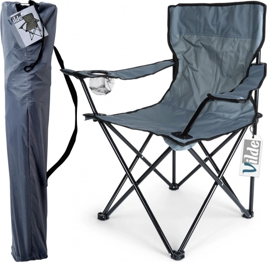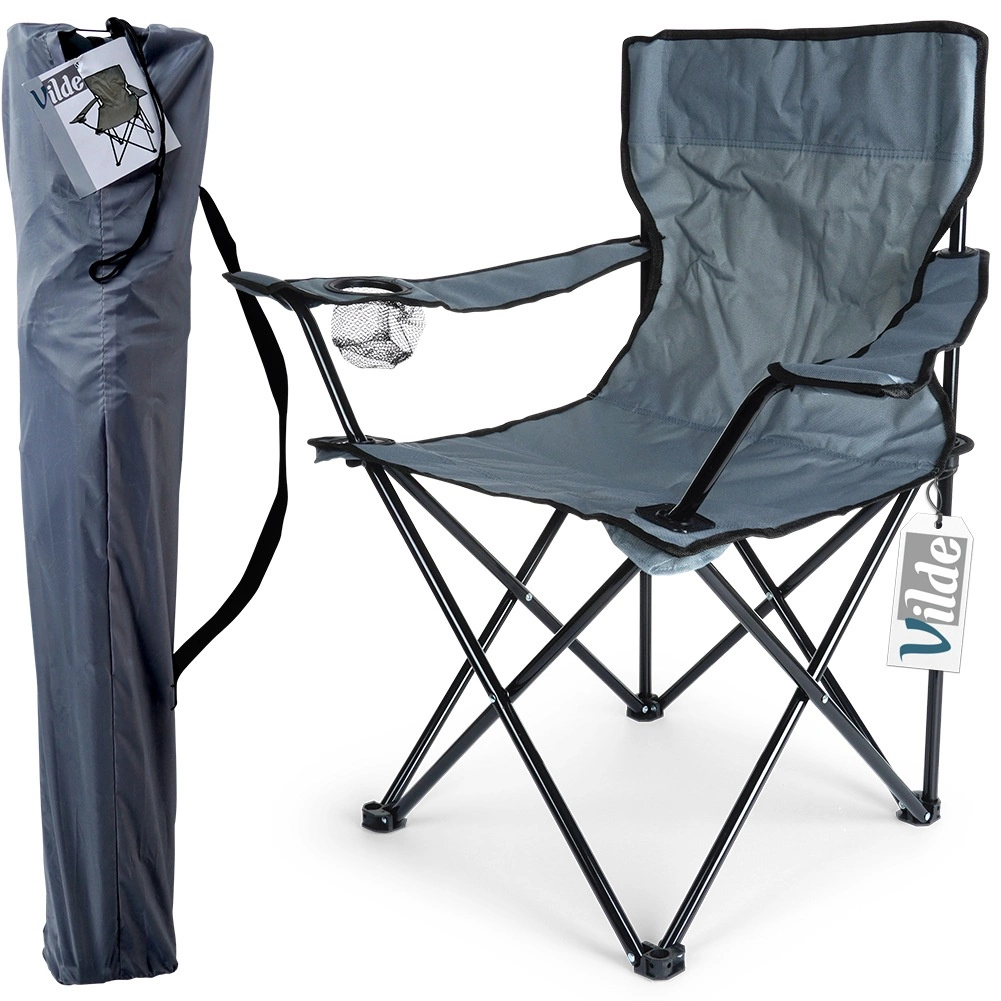 Składane krzesło turystyczne VILDE to niezawodny towarzysz wszystkich aktywności outdoorowych. Mocna stalowa rama w czarnym kolorze w połączeniu z trwałą poliestrową tkaniną zapewnia stabilność, wygodę i długą żywotność nawet przy częstym użytkowaniu na łonie natury. Praktyczne podłokietniki oraz wbudowany uchwyt na kubek lub puszkę zwiększają komfort siedzenia.
