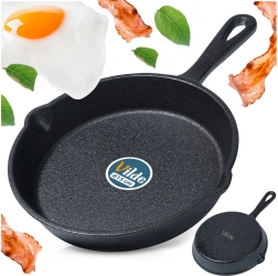 Patelnia jest idealna do kuchni i na zewnątrz – działa na wszystkich typach kuchenek, w tym na indukcji, w piekarniku, na grillu, a nawet bezpośrednio nad ogniem.