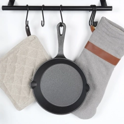 Patelnia jest w całości z żeliwa, wytrzymuje wysokie temperatury i nadaje się na kuchenkę, do piekarnika oraz bezpośrednio na grill lub ognisko. Dwie boczne wylewki ułatwiają zlewanie soków czy sosów, wygodny uchwyt z otworem pozwala na zawieszenie. Dla długiej żywotności wystarczy prosta pielęgnacja – opłukać, dokładnie wysuszyć i lekko naoliwić.