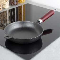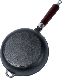 Uniwersalna żeliwna patelnia 20 cm do smażenia, pieczenia i duszenia na wszystkich typach kuchenek, w tym indukcyjnych, na grillu oraz bezpośrednio nad ogniem. Maswyna żeliwna konstrukcja doskonale akumuluje ciepło, zapewnia równomierne wypieczenie i długo utrzymuje potrawy w cieple. Ergonomiczny drewniany uchwyt i pomocnicze uszko dla bezpiecznej manipulacji, możliwość zawieszenia. Bez chemicznych powłok, przy właściwej pielęgnacji wyjątkowo odporna i długowieczna.