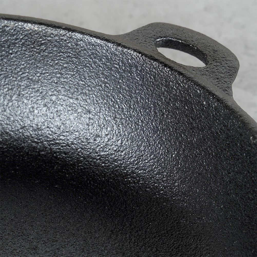 Patelnia jest wszechstronna: działa na gazie, prądzie, płycie ceramicznej, halogenie i indukcji, a także na grillu lub nad otwartym ogniem. Ma długi ergonomiczny drewniany uchwyt oraz pomocniczy uchwyt z otworem do zawieszenia. Konstrukcja bez nieprzywierających powłok jest naturalnie odporna – wystarczy regularnie natłuszczać/seasonować.