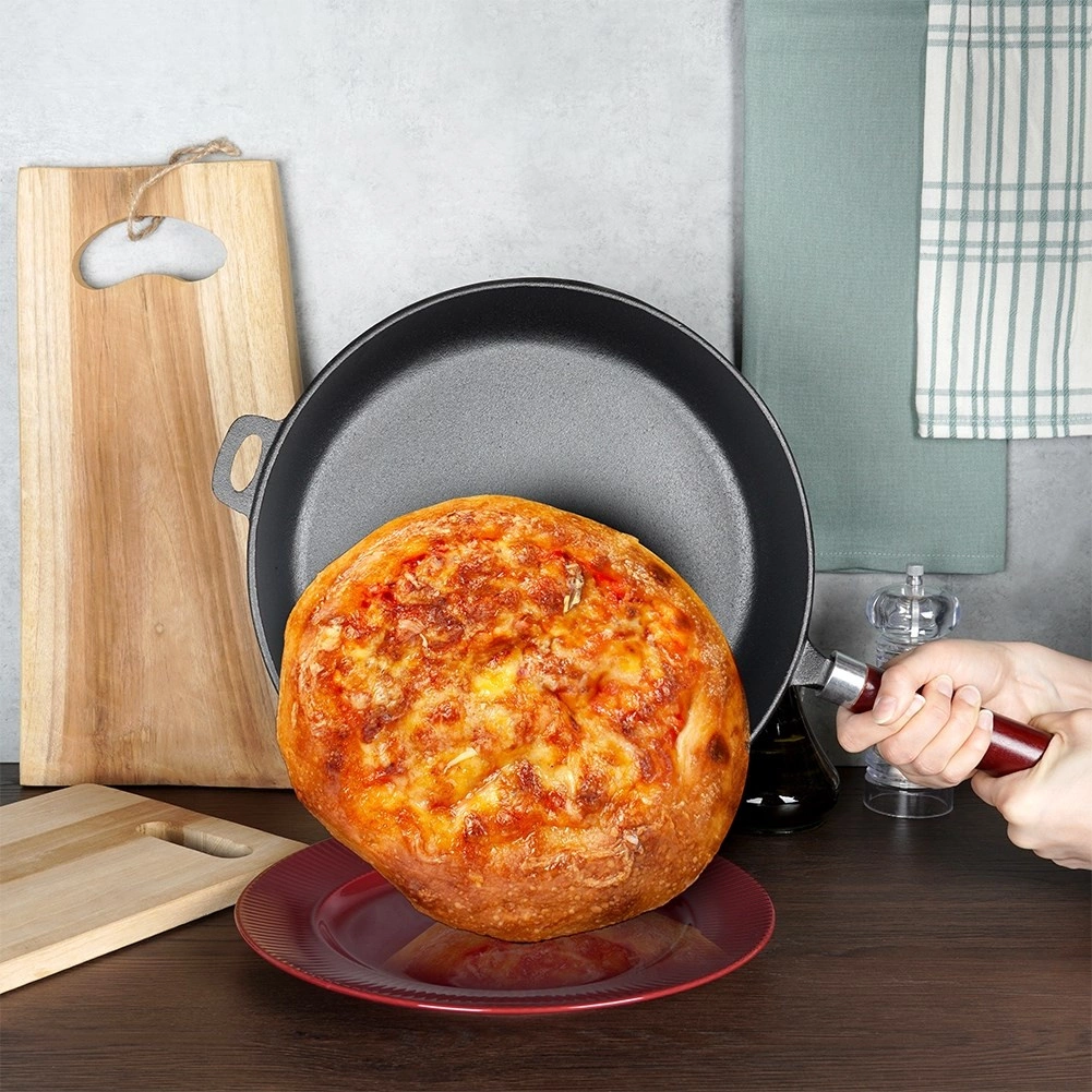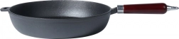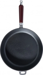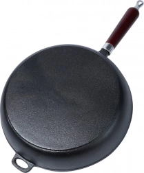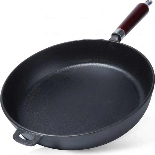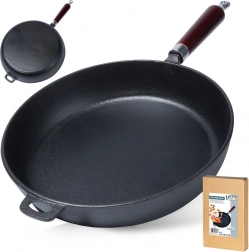 Praktyczna drewniana rączka zapewnia pewny chwyt, pomocnicze ucho ułatwia manipulację i zawieszenie. Patelnię można używać na wszystkich typach kuchenek, w tym na indukcji, a także na grillu i otwartym ogniu. Po odkręceniu rączki nadaje się również do piekarnika. Bez powłok nieprzywierających – czyste żeliwne naczynie dla naturalnych rezultatów gotowania.