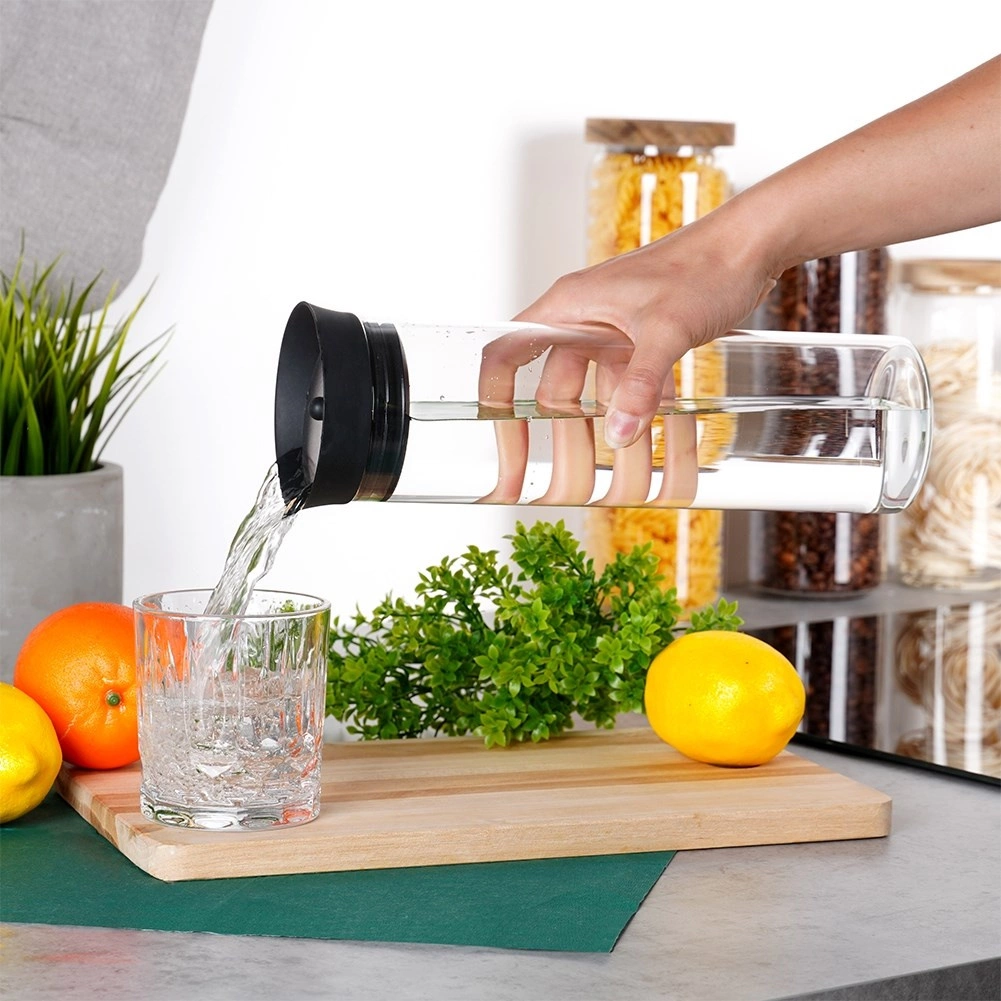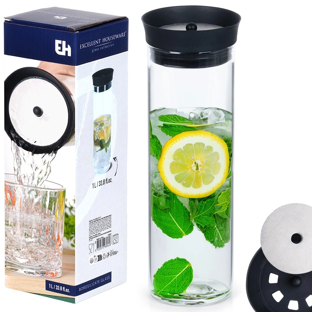Ta uniwersalna karafka wykonana jest z przezroczystego szkła borokrzemowego, które wyróżnia się odpornością i eleganckim wyglądem. Pokrywka z połączenia silikonu i stali nierdzewnej zapewnia czyste nalewanie bez kapania, a jednocześnie chroni napój przed zanieczyszczeniami i owadami.