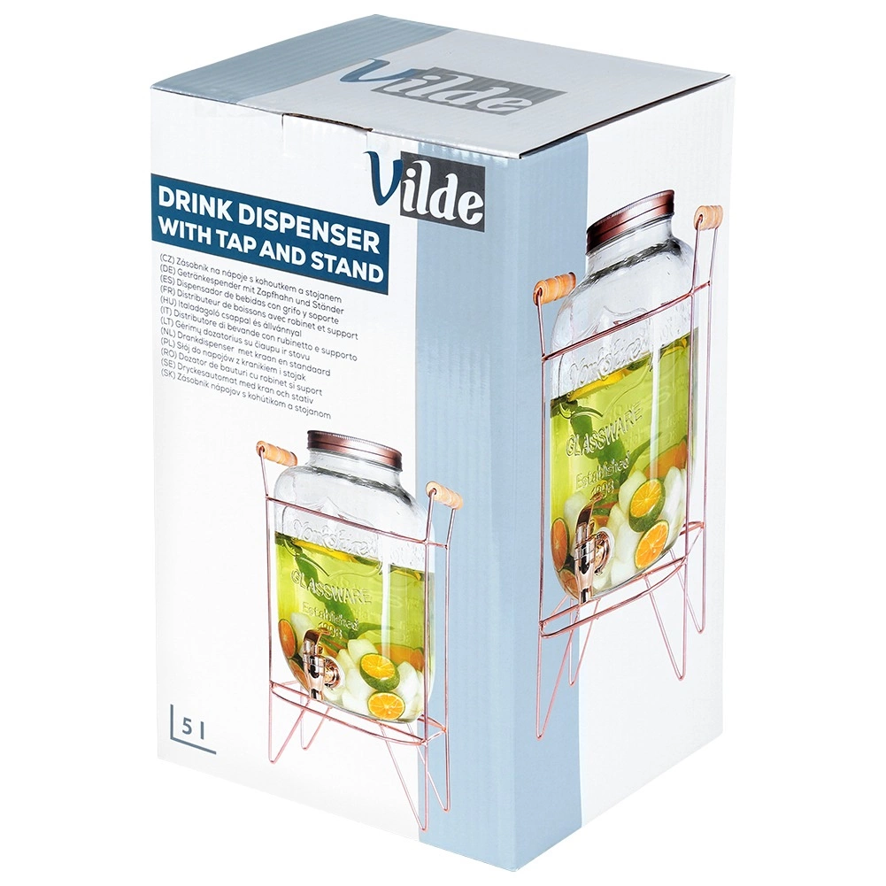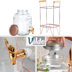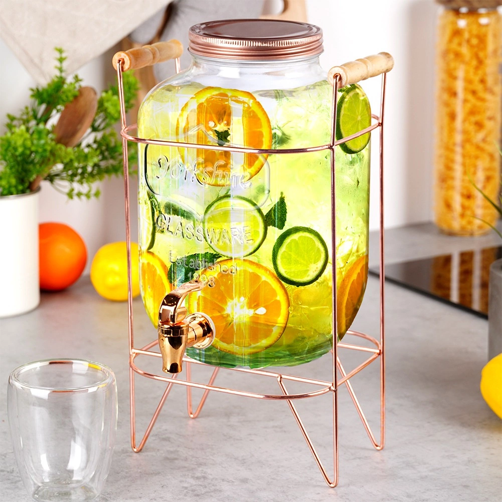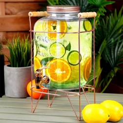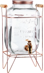 Elegancki szklany dyspenser do napojów o pojemności 5,5 l na solidnym metalowym stojaku w kolorze różowego złota jest idealny na lemoniady, wodę, mrożoną herbatę i poncz. Dzięki kranikowi z uszczelką nalewanie jest wygodne i czyste, a nakrętka chroni napój przed owadami. Przezroczyste, grube szkło z tłoczeniem stylowo eksponuje owoce i lód.