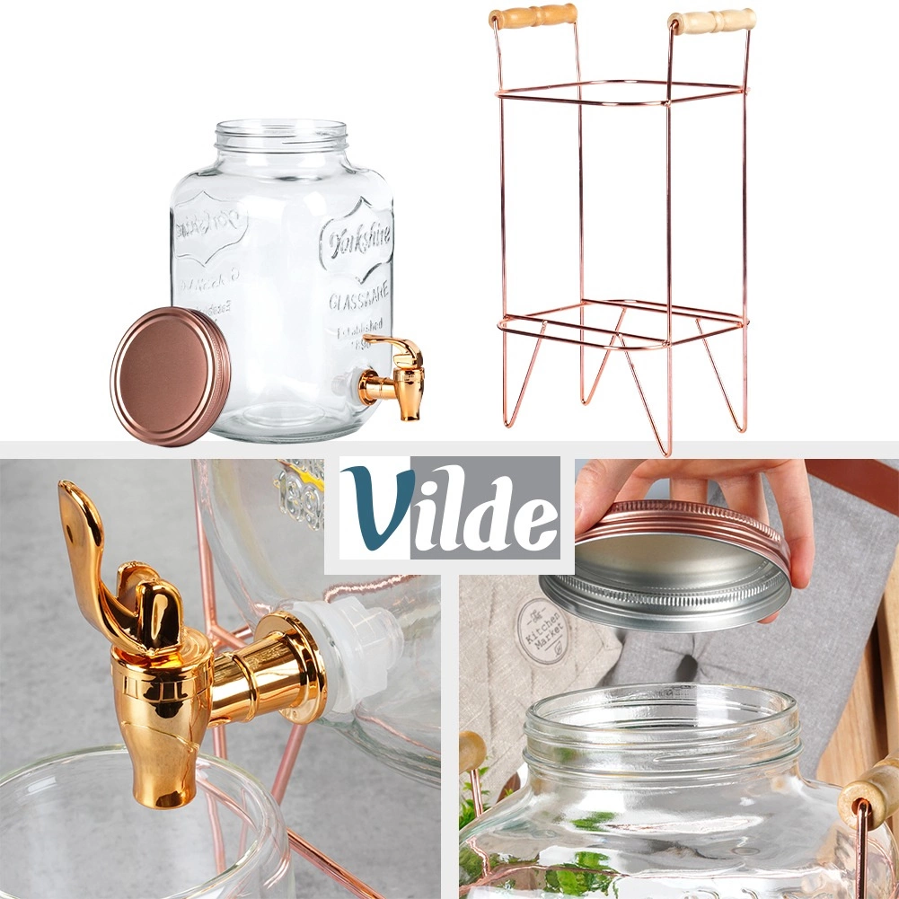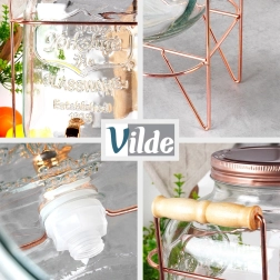 Ten stylowy dyspenser do napojów łączy wytrzymałe grube szkło z solidną metalową konstrukcją stojaka w odcieniu różowego złota oraz drewnianymi uchwytami dla łatwego przenoszenia. Praktyczny kranik umożliwia płynne nalewanie bez rozlewania, a nakrętka utrzymuje zawartość w czystości i chroni ją. Świetne rozwiązanie na garden party, rodzinne uroczystości i catering.