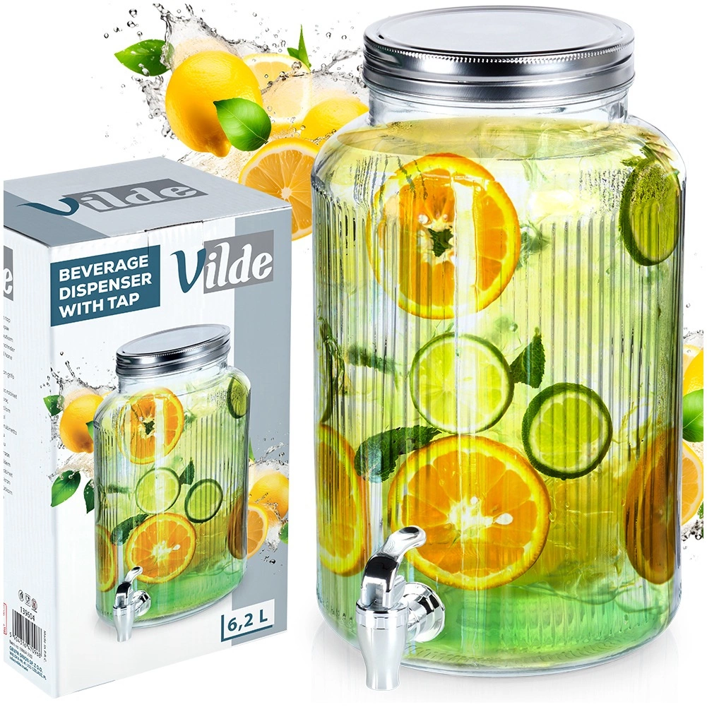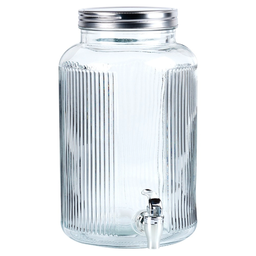 Elegancki szklany dyspenser do napojów o pojemności 6,2 l z praktycznym kranikiem i nakręcanym wieczkiem łączy styl i funkcjonalność do serwowania lemoniady, wody z owocami czy mrożonej herbaty. Wytrzymałe grube szkło o ryflowanym wzorze jest bezpieczne dla żywności i świetnie prezentuje się zarówno na ogrodowym przyjęciu, jak i w domu.