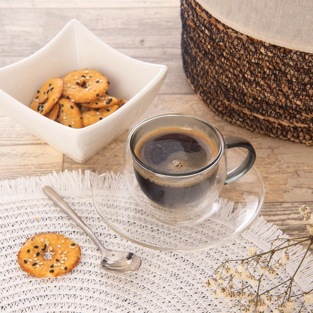 Przezroczysta forma z ciemnym akcentem wydobywa barwę kawy i cremę – serwuj espresso efektownie i elegancko.