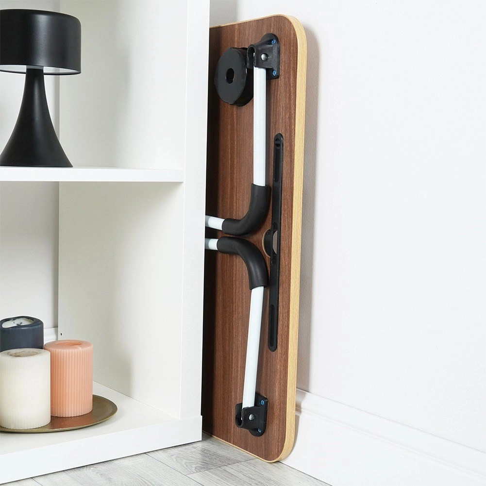 Metalowa rama w białym kolorze z antypoślizgowymi końcówkami zapewnia stabilność, a lekka płyta MDF w dekorze jasnego drewna jest przyjemna w dotyku i łatwa w czyszczeniu. Stolik szybko składa się na płasko, aby oszczędnie przechować go za szafą lub pod łóżkiem.