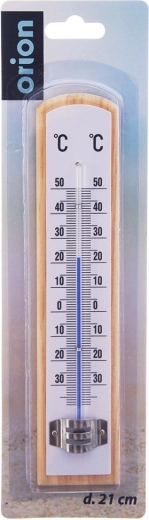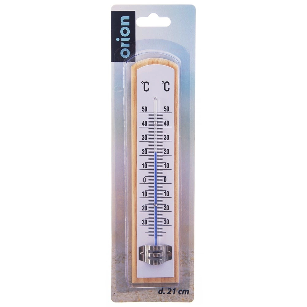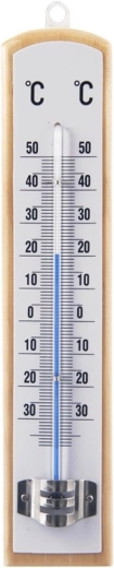 Uniwersalny drewniany termometr do pomiaru temperatury wewnątrz i na zewnątrz z czytelną skalą od -38 °C do 50 °C. Klasyczny design, naturalne drewno, możliwość zawieszenia na ścianie i łatwy odczyt temperatury na balkonie, tarasie oraz we wnętrzach.