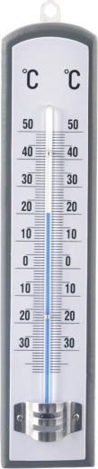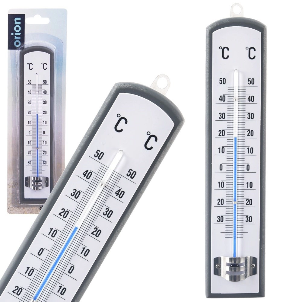 Klasyczny analogowy termometr do pomiaru temperatury w domu i na zewnątrz. Ma czytelną skalę w °C od -38 °C do 50 °C, drewniane wykonanie w szarym dekorze oraz możliwość zawieszenia na ścianie. Idealny na balkon, taras, do kuchni i do ogrodu.