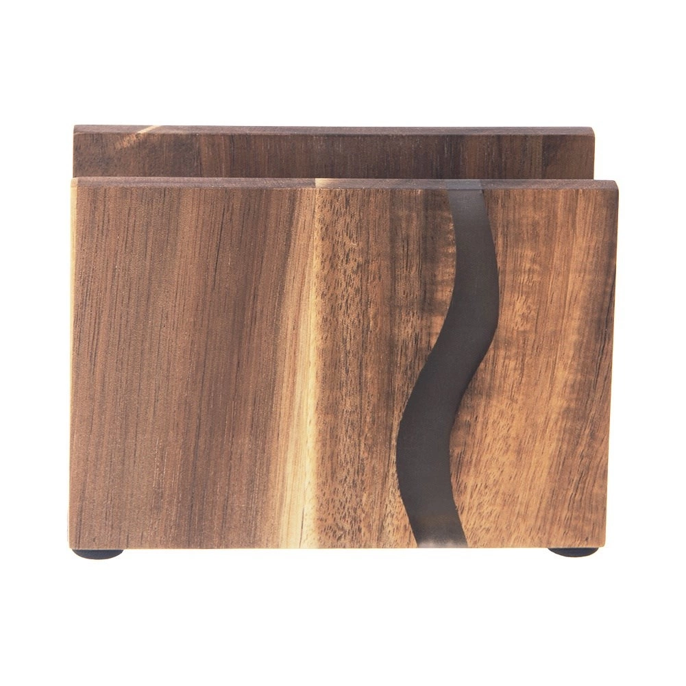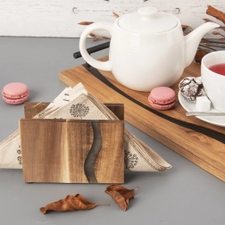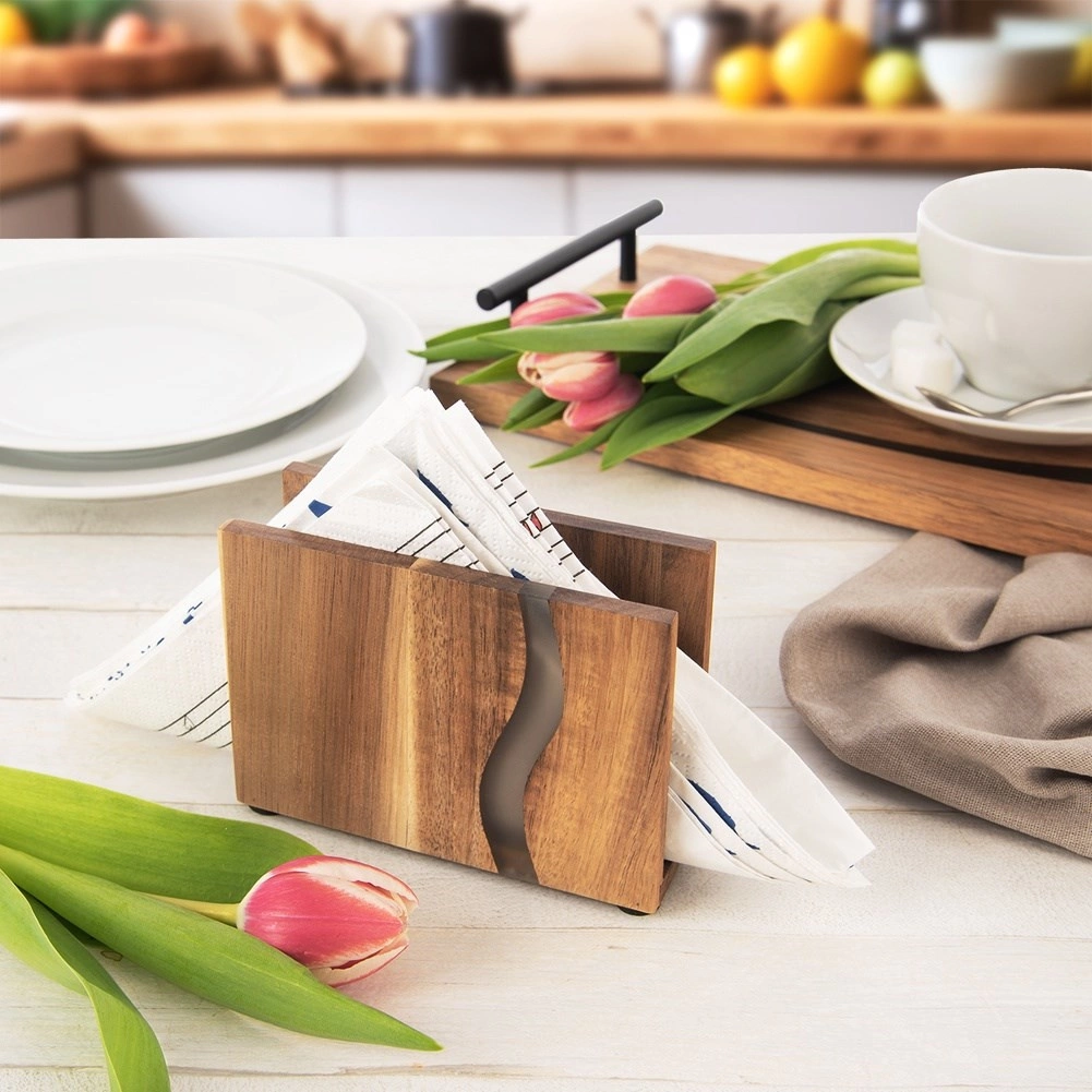 Zadbaj o porządek i styl na swoim stole. Stojak na serwetki River wykonany jest z naturalnego drewna akacjowego z wtopioną żywicą epoksydową, która przywodzi na myśl nurt rzeki. Łączy funkcjonalność z nowoczesnym, naturalnym wyglądem, dzięki czemu stanie się wyrazistym dodatkiem do kuchni, jadalni i kawiarni.