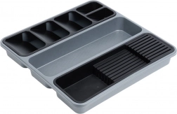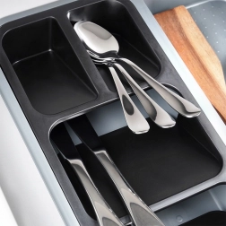 Wnętrze środkowej przegródki ma powierzchnię antypoślizgową, która zapobiega przemieszczaniu się sztućców i akcesoriów. Wysokiej jakości plastik w szarym kolorze z czarnymi wkładami jest wytrzymały, łatwy w utrzymaniu i można go myć w zmywarce. Idealny dodatek do każdej kuchni, który oszczędza miejsce i przyspiesza gotowanie.
