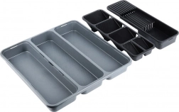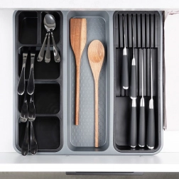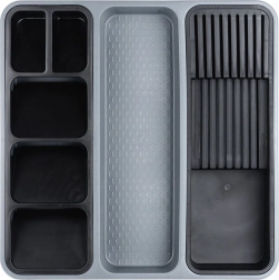 Praktyczny organizer do szuflady dla perfekcyjnego porządku w kuchni. Ma kilka przegródek, wyjmowane moduły oraz specjalny blok na noże. Dzięki podzielonym sekcjom sztućce, noże i akcesoria kuchenne będą bezpiecznie przechowywane i zawsze pod ręką. Wykonany z wytrzymałego plastiku, łatwy w czyszczeniu i odpowiedni do zmywarki.