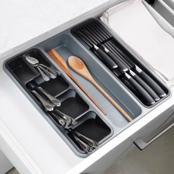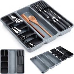 Ułóż swoją kuchnię w kilka chwil. Ten szary organizer o wymiarach 40 × 40 × 5 cm oferuje sprytne rozplanowanie przegródek, w tym wyjmowane wkłady – jeden przeznaczony na maksymalnie 9 noży, drugi do przejrzystego sortowania sztućców. Dzięki temu każdy element pozostaje na swoim miejscu, a w szufladzie zawsze panuje porządek.
