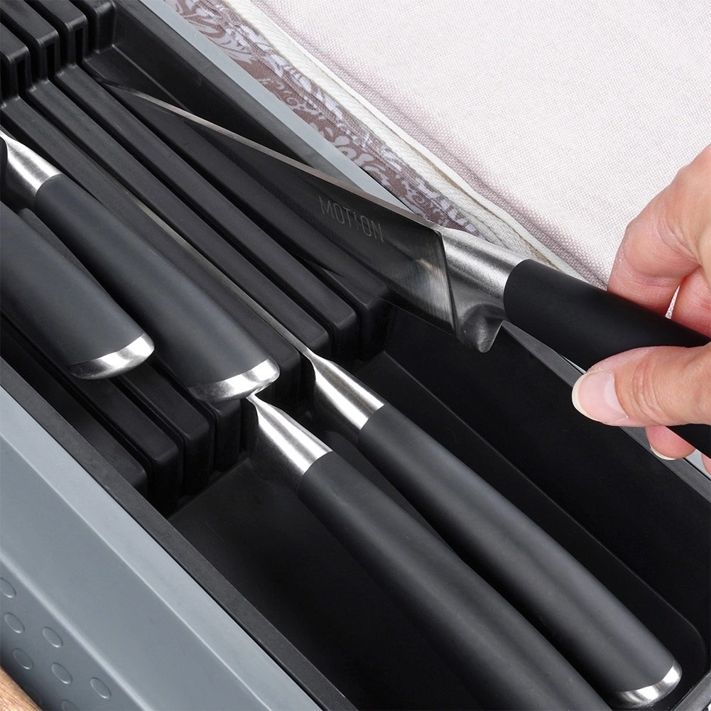 Specjalny blok z osobnymi rowkami utrzymuje noże oddzielone, chronione i zawsze pod ręką. Oszczędza miejsce i zwiększa bezpieczeństwo w szufladzie.