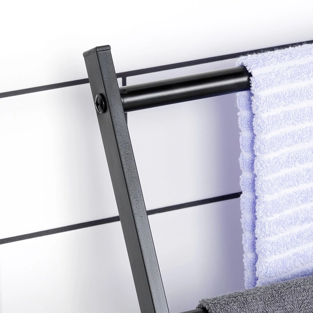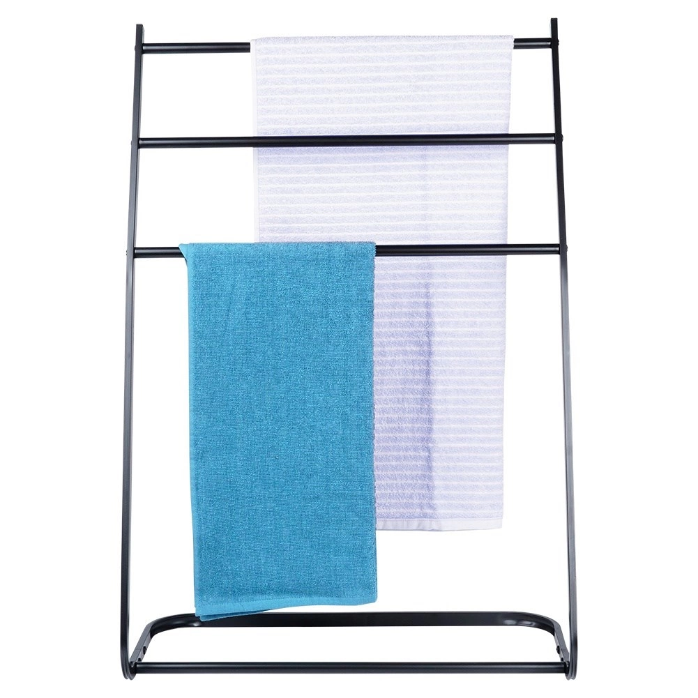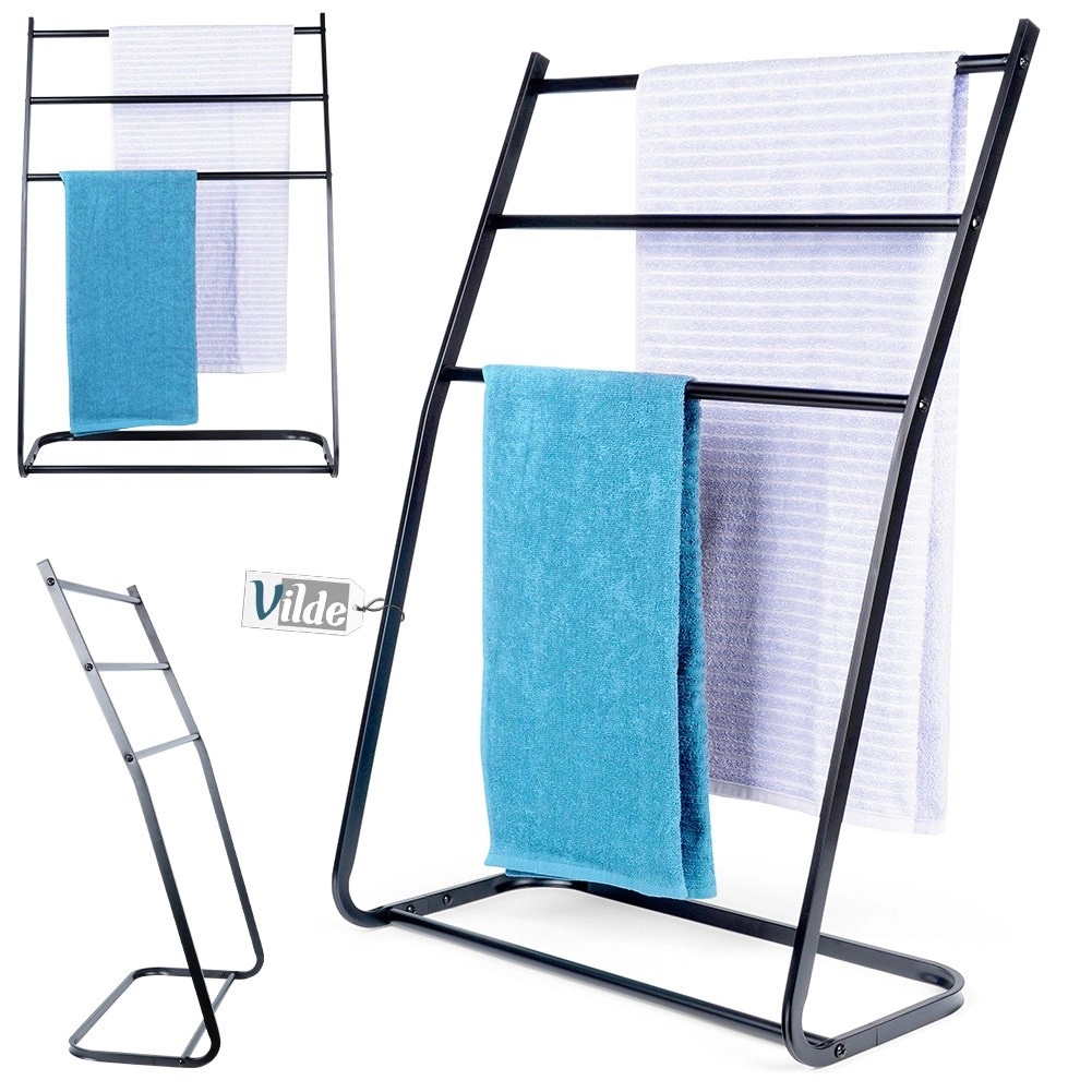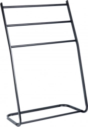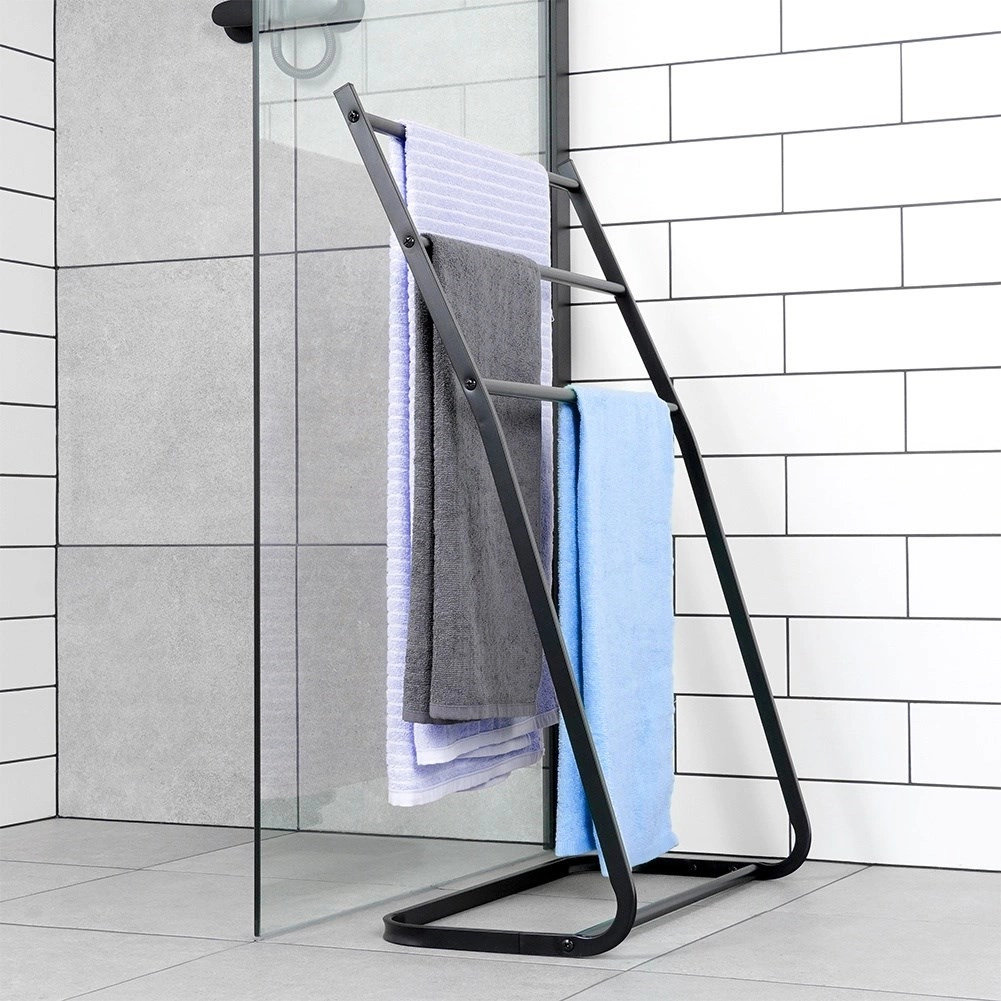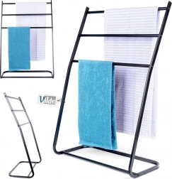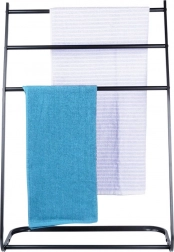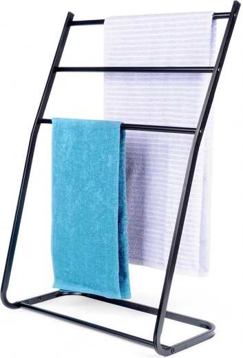 Wolnostojący metalowy stojak na ręczniki lub odzież oferuje trzy solidne poprzeczki na różnych poziomach, co zapewnia optymalny przepływ powietrza i szybsze suszenie. Minimalistyczny design w czarnym kolorze wygląda czysto i ponadczasowo, dlatego świetnie pasuje do łazienek w stylu nowoczesnym i klasycznym.