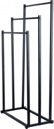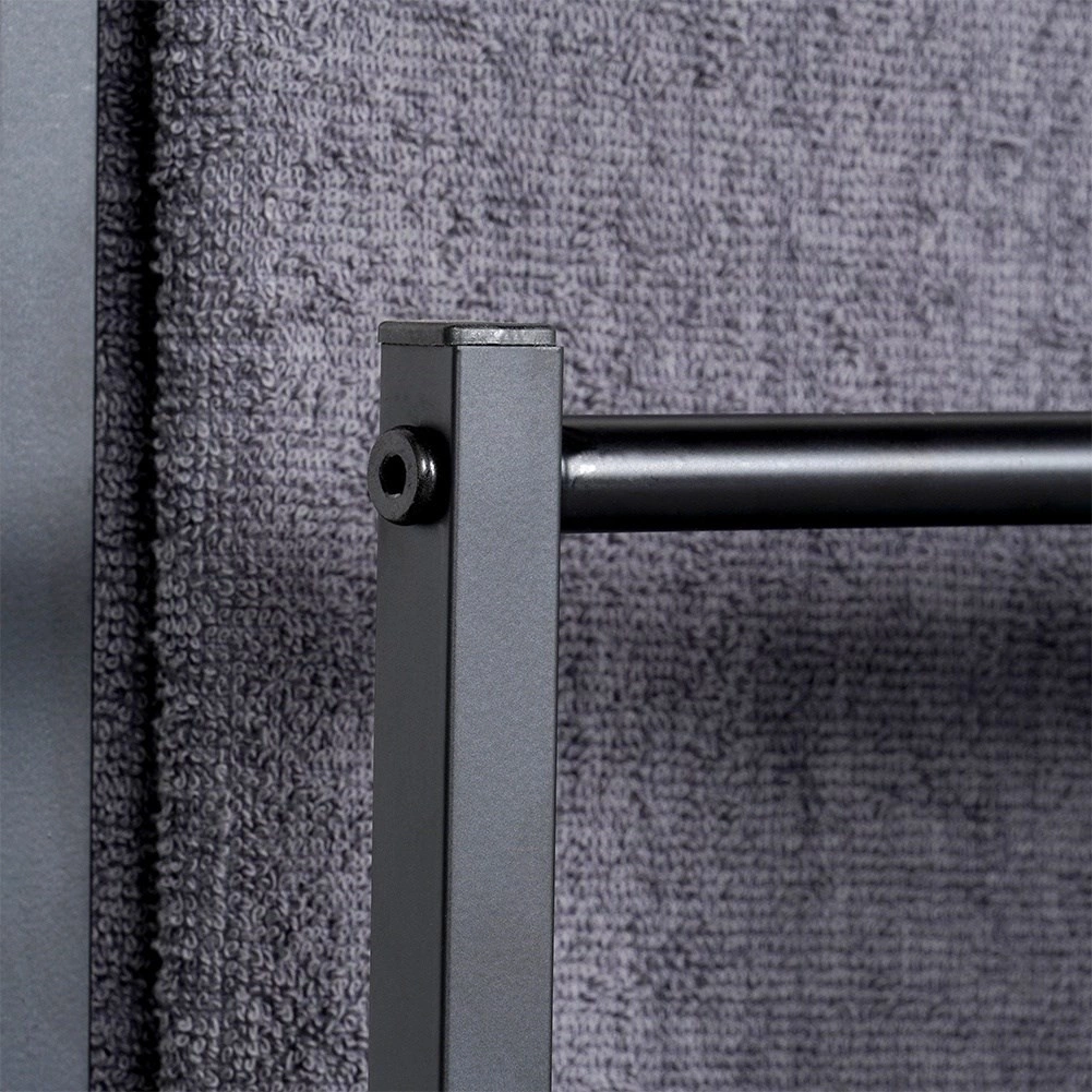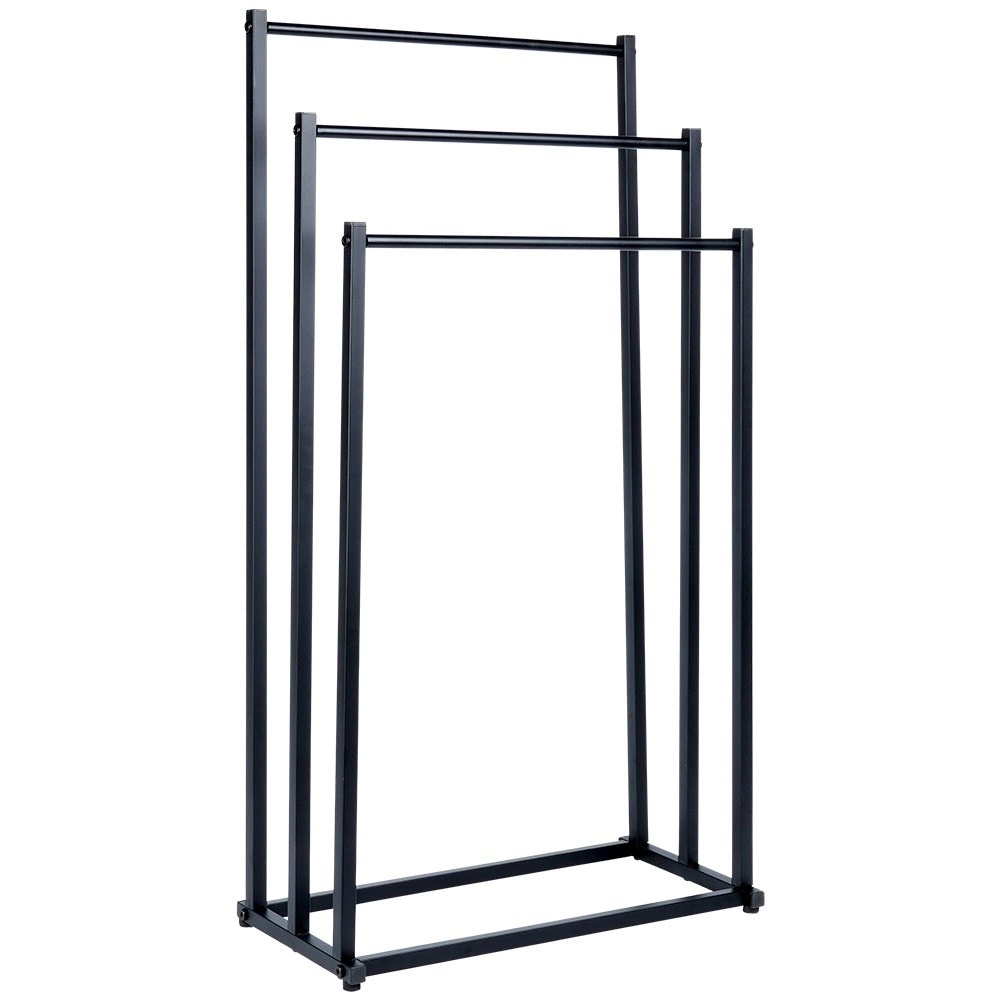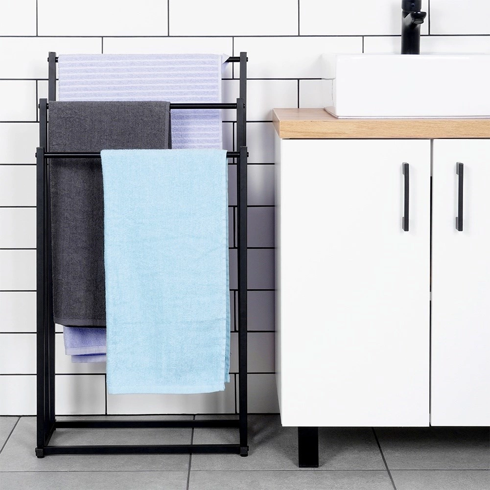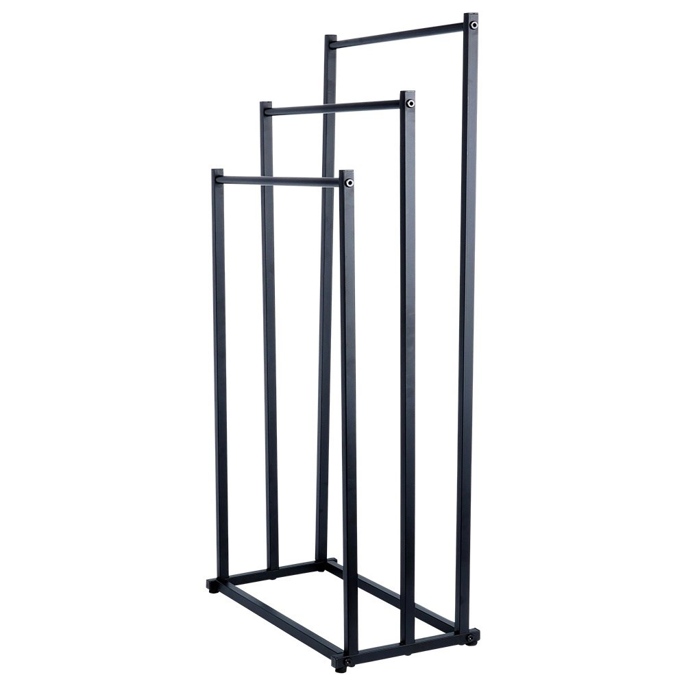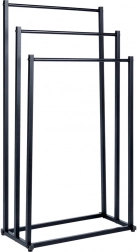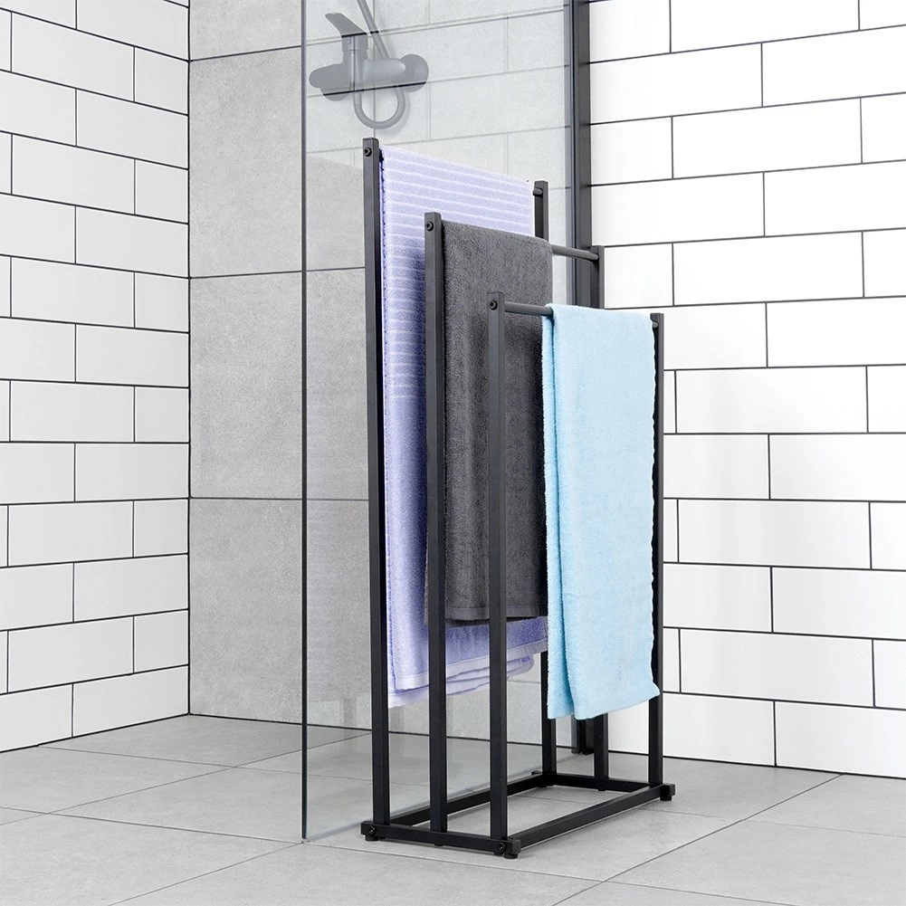 Praktyczny wolnostojący wieszak na ręczniki lub ubrania z trzema stopniowo rozmieszczonymi poprzeczkami zapewnia przejrzyste przechowywanie i lepszą cyrkulację powietrza dla szybszego wysychania. Minimalistyczny wygląd w matowej czerni świetnie komponuje się z nowoczesnymi wnętrzami i nadaje łazience industrialny charakter.