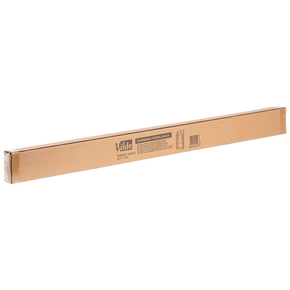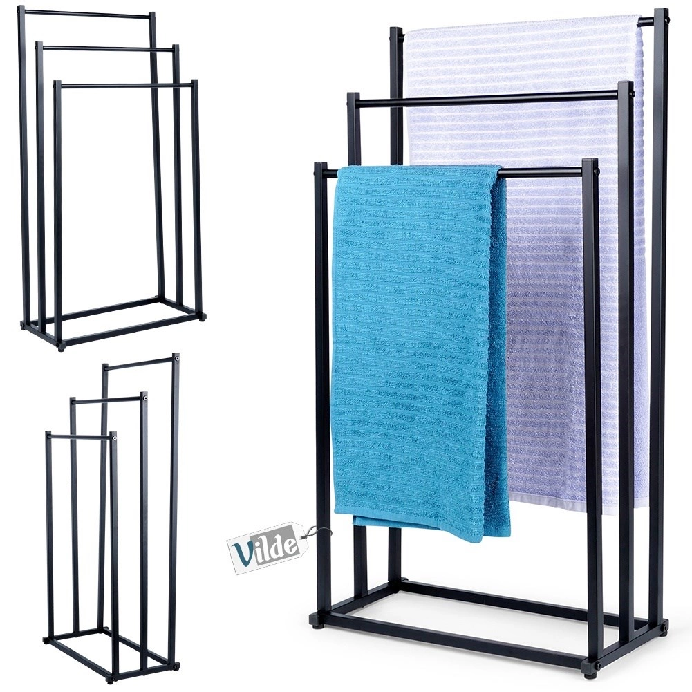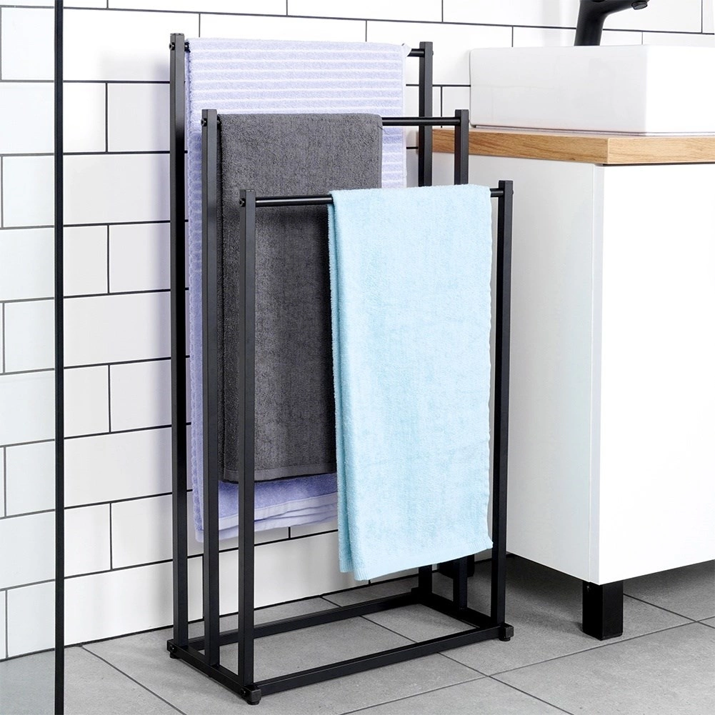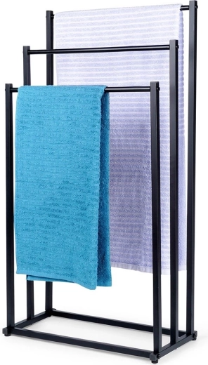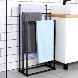 Elegancki wolnostojący wieszak na ręczniki z potrójnymi poprzeczkami zapewnia szybkie schnięcie, oszczędność miejsca oraz stabilną metalową konstrukcję z czarną, proszkowo malowaną powłoką. Idealny do nowoczesnej i klasycznej łazienki, łatwy montaż i stylowy loftowy design.