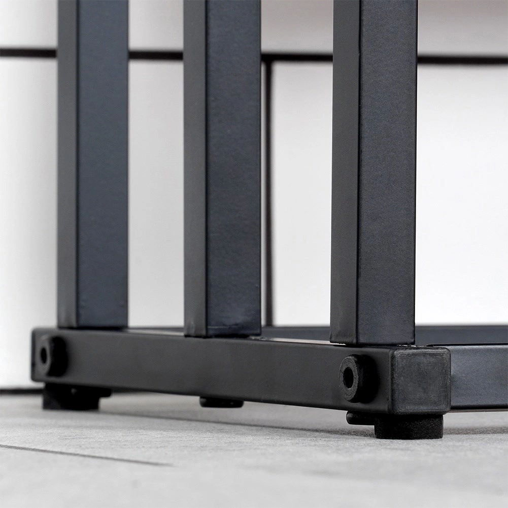 Solidny korpus z metalu malowanego proszkowo gwarantuje wysoką stabilność. Antypoślizgowe i ochronne stopki zabezpieczają podłogę przed zarysowaniami i pomagają wyrównać nierówności. Dzięki prostej konstrukcji montaż jest szybki i łatwy – w zestawie znajdują się potrzebne śruby.