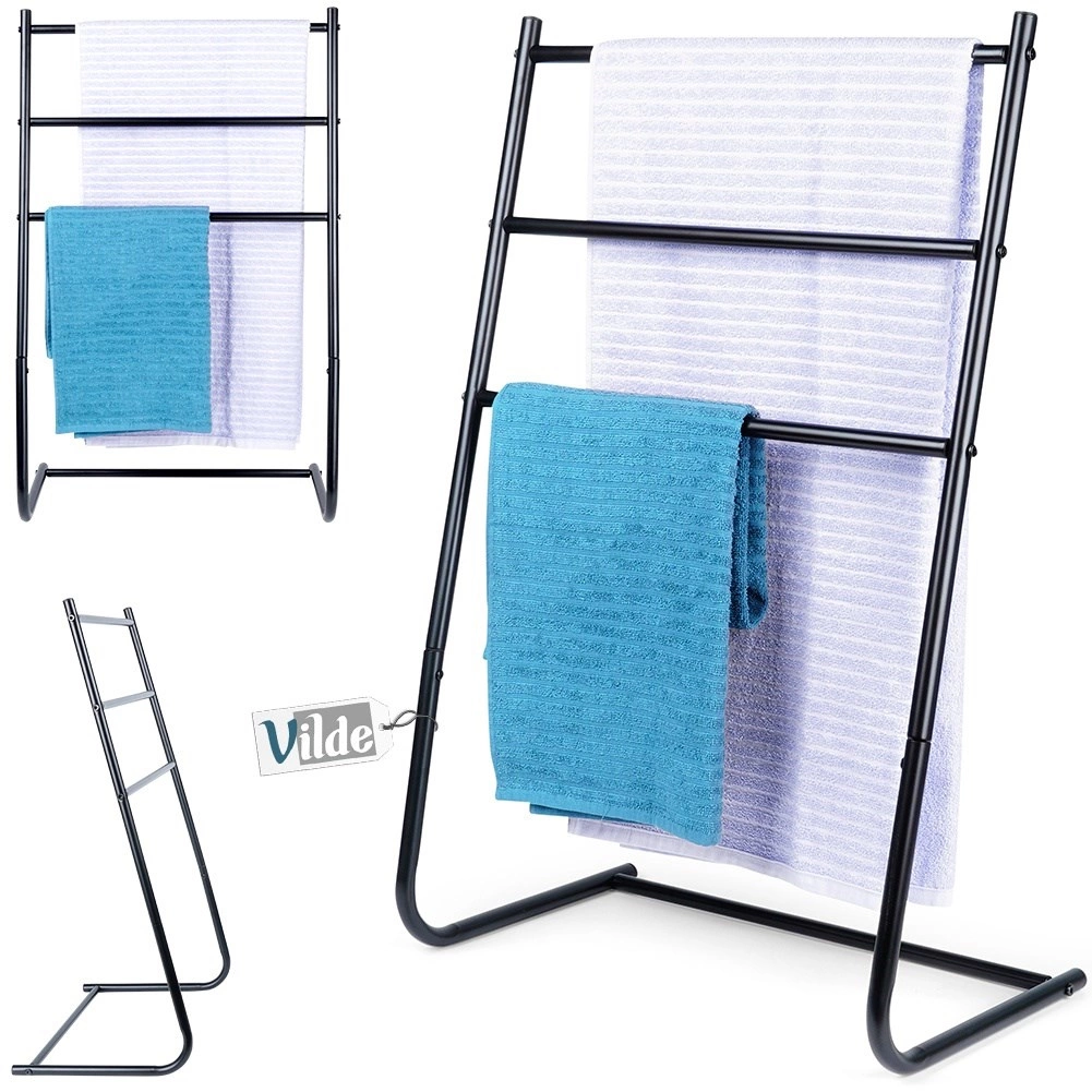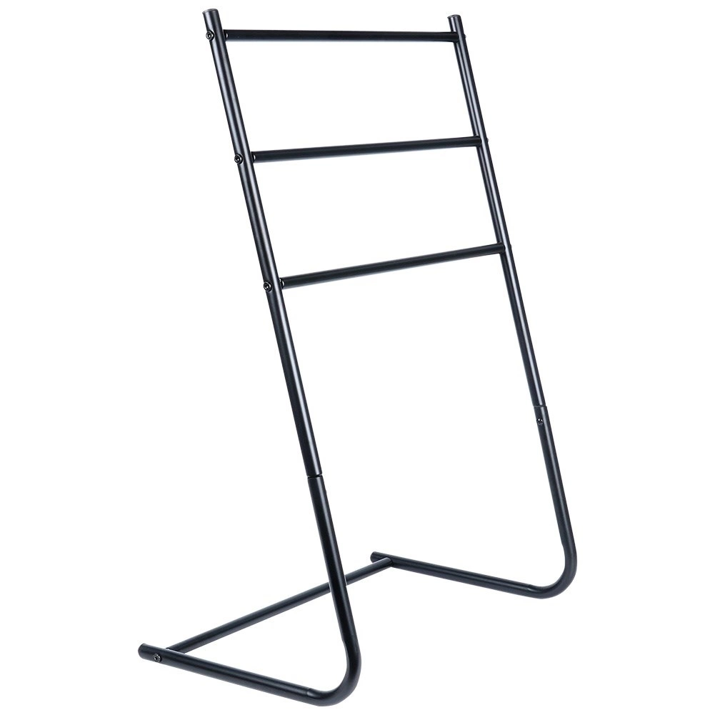Elegancki, wolnostojący wieszak na ręczniki z trzema poprzeczkami oferuje stabilną metalową konstrukcję, wielopoziomowe suszenie i stylowy industrialny design w czarnym kolorze. Idealny do uporządkowanego i szybkiego suszenia ręczników bez wiercenia w ścianie.
