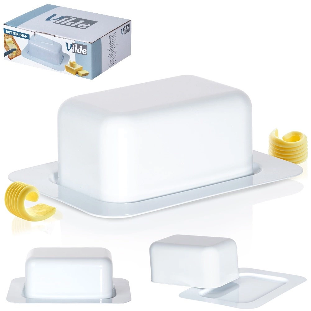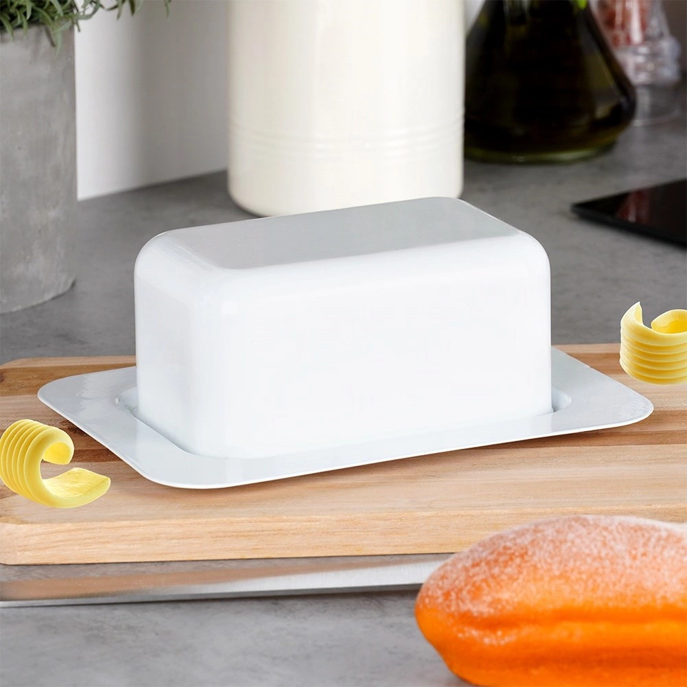 Elegancka maselniczka z wysokiej jakości stali w białym kolorze do codziennego użytku. Utrzymuje masło świeże dzięki praktycznej pokrywce i jest łatwa w czyszczeniu. Odpowiednia do serwowania oraz przechowywania w lodówce. Klasyczny design, trwałe wykonanie i łatwa pielęgnacja dla nowoczesnej kuchni.