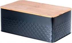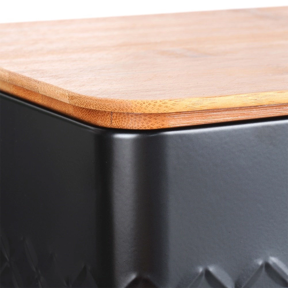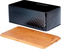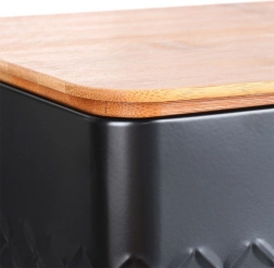 Stylowy chlebak łączy trwały, proszkowo malowany metalowy korpus w matowej czerni z naturalną bambusową pokrywką. Pokrywkę można używać jako praktycznej deski, więc pieczywo pokroisz dokładnie tam, gdzie je przechowujesz. Projekt z tłoczoną teksturą nadaje chlebakowi nowoczesny wygląd i łatwo wpisuje się zarówno w minimalistyczne, jak i naturalne aranżacje kuchni.