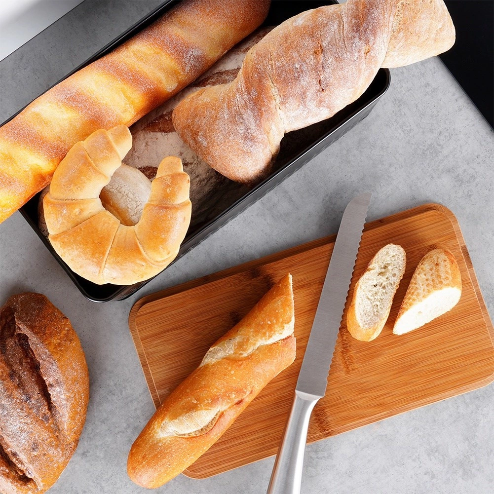 Dzięki przemyślanemu zamknięciu i wystarczającej pojemności wygodnie pomieści chleb, bułki, bagietki i słodkie wypieki. Metalowa konstrukcja chroni przed uszkodzeniami mechanicznymi i ogranicza dostęp powietrza, co wydłuża świeżość i smak pieczywa.