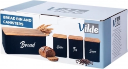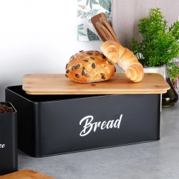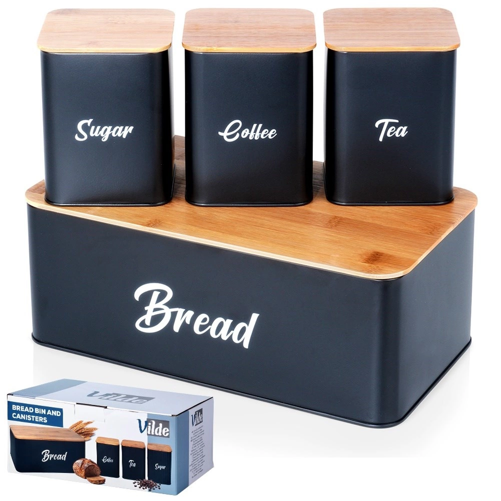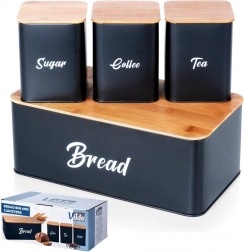 Chlebak z wytrzymałego metalu malowanego proszkowo wyróżnia się czystymi liniami i praktyczną pokrywką z bambusa, którą można użyć jako deskę do krojenia. Metalowa konstrukcja chroni pieczywo przed zgnieceniem i ogranicza wysychanie. Trzy dopasowane pojemniki z bambusowymi pokrywkami utrzymują cukier, kawę i herbatę dłużej aromatyczne i przejrzyście uporządkowane.