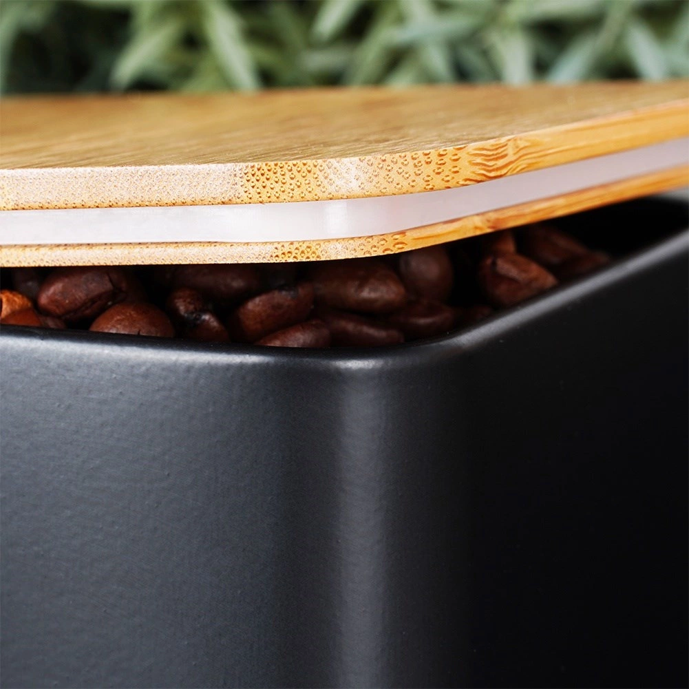 Trzy metalowe pojemniki z bambusowymi pokrywkami utrzymują sypkie produkty dłużej świeże. Wyraźne opisy i spójny wygląd gwarantują porządek i elegancję na blacie.