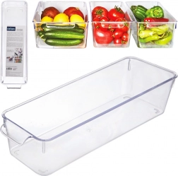 Ten praktyczny kuchenny organizer z wysokiej jakości przezroczystego plastiku ułatwia segregowanie i przechowywanie żywności w lodówce i spiżarni. Transparentne wykonanie zapewnia natychmiastowy podgląd zawartości, a zintegrowane boczne uchwyty umożliwiają łatwe wysuwanie i przenoszenie. Nie posiada pokrywki, dzięki czemu zapewnia szybki dostęp do produktów.