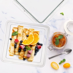 Ten niski, kwadratowy pojemnik na żywność o pojemności 900 ml zapewnia niezawodne i higieniczne przechowywanie Twoich potraw. Przezroczyste korpus pozwala od razu sprawdzić zawartość bez otwierania, a solidna pokrywka z 4 klipsami i silikonową uszczelką gwarantuje szczelność i minimalizuje ulatnianie się zapachów.