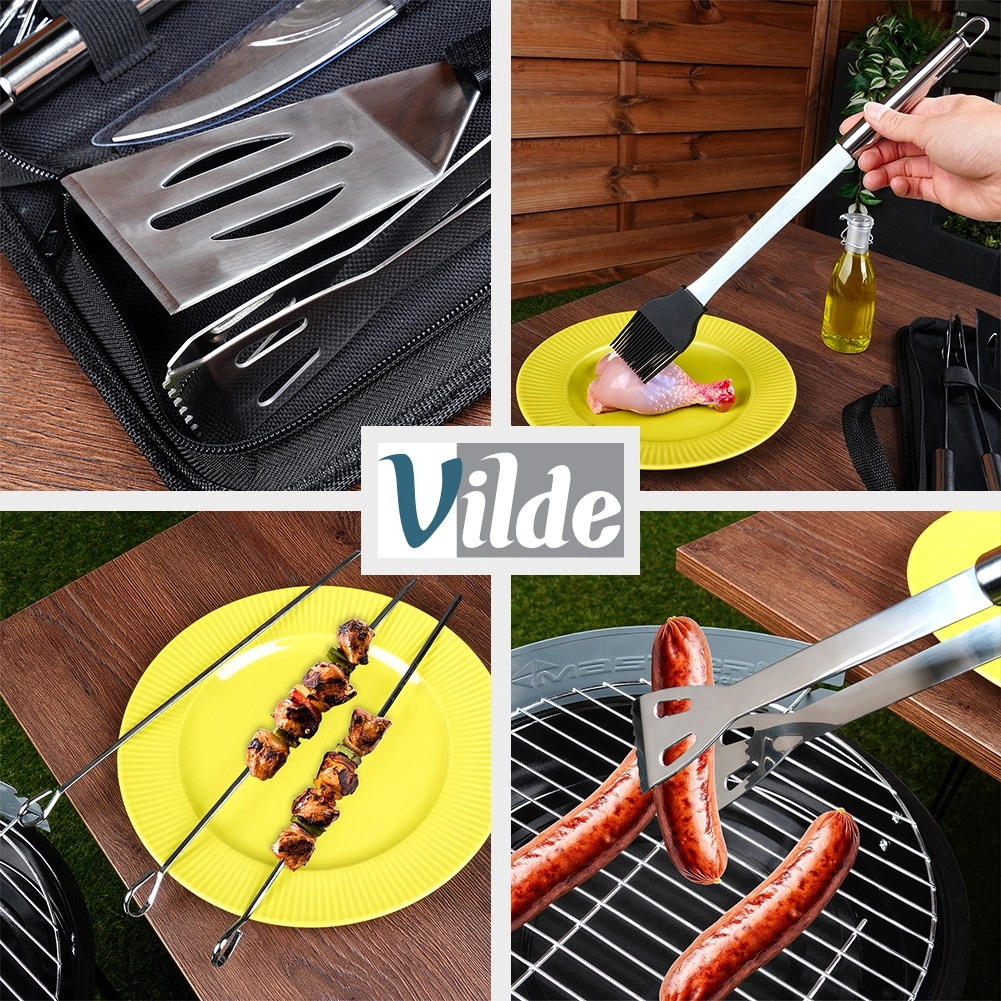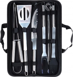 - Łopatka (35 cm), szczypce (34,5 cm), widelec (35 cm), nóż (32 cm), silikonowy pędzelek (34 cm), 4× szpikulec (35 cm), etui
