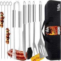 - Zawartość zestawu (10 szt.): 1× łopatka 35 cm, 1× szczypce 34,5 cm, 1× widelec 35 cm, 1× nóż 32 cm, 1× silikonowy pędzelek 34 cm, 4× szpikulec 35 cm, 1× etui.