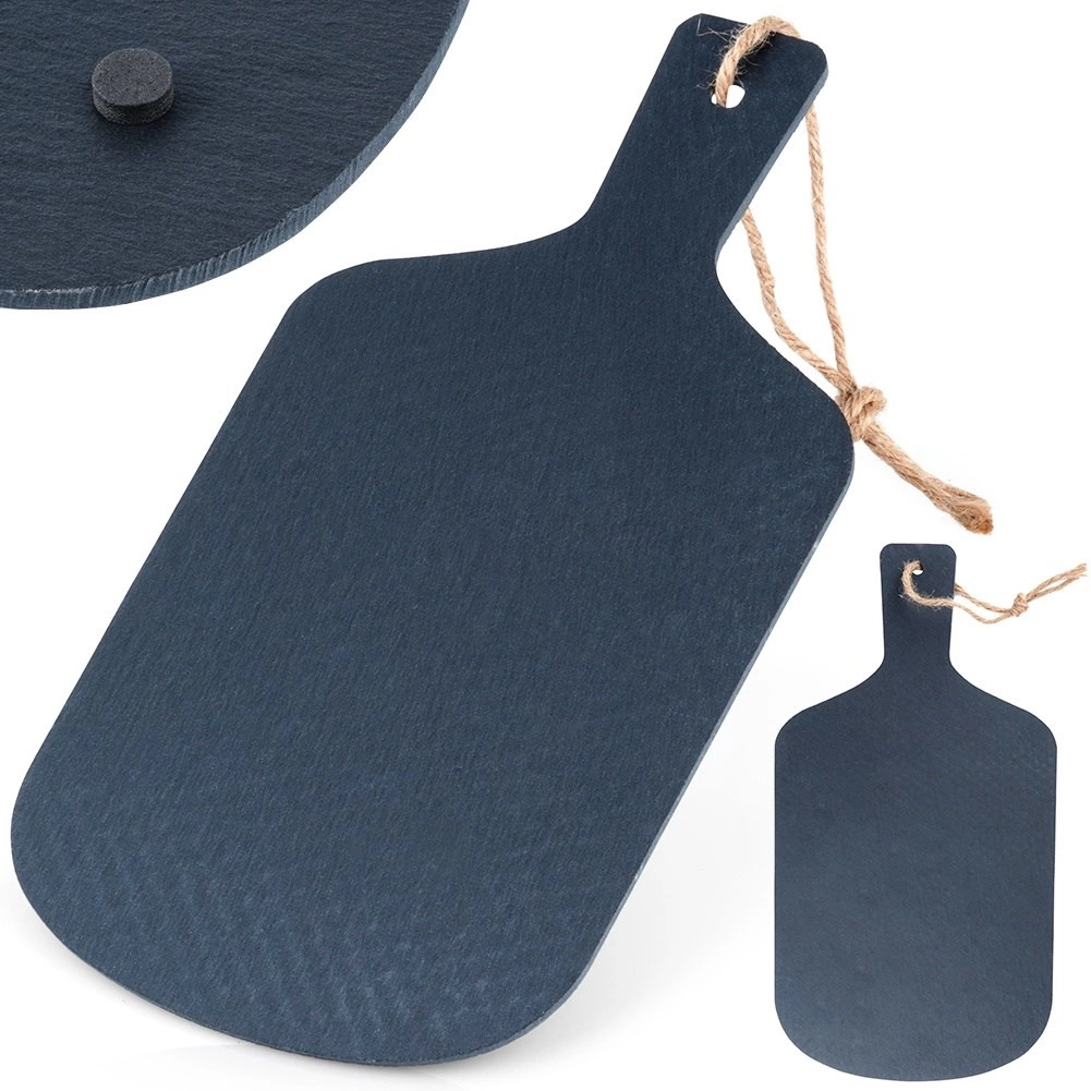 Elegancka deska do serwowania z naturalnego kamienia łupkowego w czarnym kolorze z praktycznym uchwytem i sznurkiem do zawieszenia. Idealna do serów, wędlin, deserów i przystawek, z antypoślizgowymi podkładkami dla stabilności. Sprawdzi się także jako stylowa podkładka pod naczynia.
