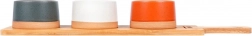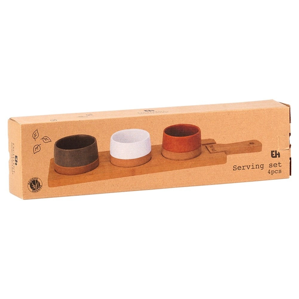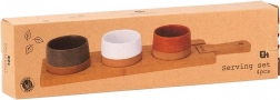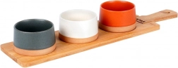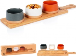Ten elegancki zestaw misek z bambusową deską jest idealny do serwowania przekąsek, antipasti, dipów i sosów. Dzięki frezowanym miejscom na miski wszystko pozostaje stabilne także podczas przenoszenia. Minimalistyczny design sprawdzi się w nowoczesnych i tradycyjnych wnętrzach i stanowi świetny pomysł na prezent do nowego domu.