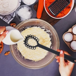Spirala łatwo dociera do kątów naczyń i pomaga szybko rozmieszać sosy oraz ciasta na gładko, bez grudek.