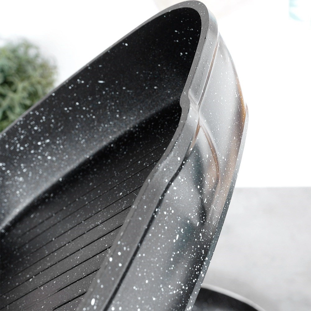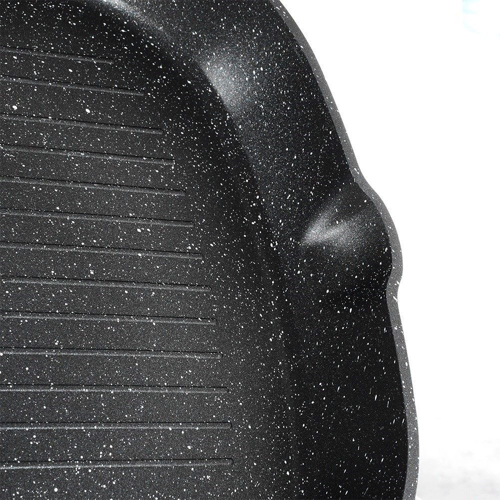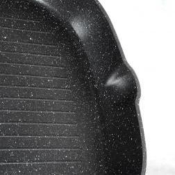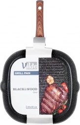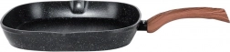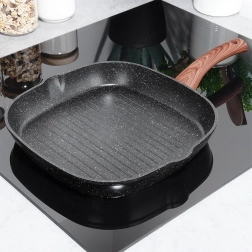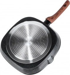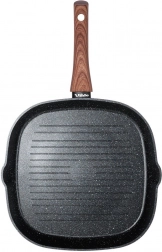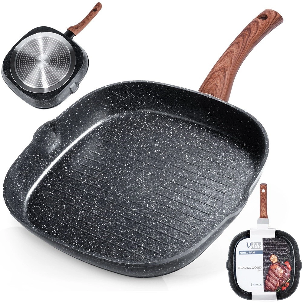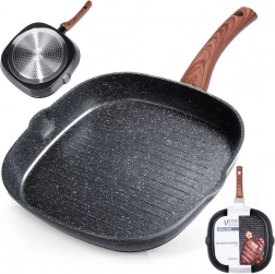 Kwadratowa patelnia grillowa 28 × 28 cm z masywnym odlewem aluminiowym i nieprzywierającą powłoką granitową zapewnia wyraźne paski grillowe oraz równomierne rozprowadzanie ciepła. Ma podwójne dzióbki do łatwego zlewania soków, ergonomiczną rączkę z imitacją drewna i nadaje się na wszystkie typy kuchenek, w tym indukcję, a także do zmywarki.