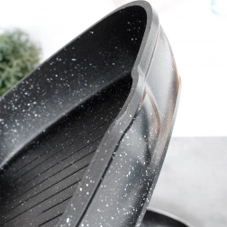 Stylowa patelnia grillowa w połączeniu czarnego kamiennego wyglądu i drewna doda kuchni nowoczesnego charakteru i umożliwi zdrowe gotowanie z minimum tłuszczu. Wyższe żebrowanie odprowadza nadmiar tłuszczu, gwarantuje wyraźne ślady sear i soczysty efekt dla mięsa, warzyw i burgerów.