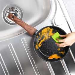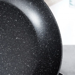 Specjalna granitowa warstwa zapobiega przywieraniu i umożliwia przygotowanie potraw z minimalną ilością tłuszczu. Jedzenie łatwo odchodzi od powierzchni, a patelnia szybko się czyści.