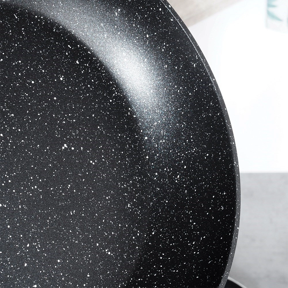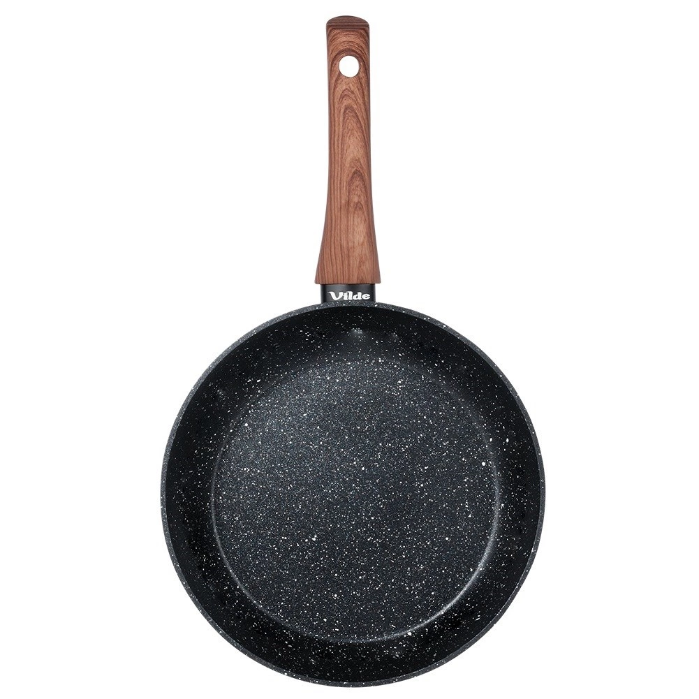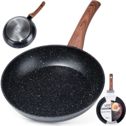 Ta stylowa patelnia w połączeniu czerni i dekoru drewna zapewnia szybkie i równomierne rozprowadzanie ciepła dla oszczędnego smażenia i duszenia. Wytrzymała, nieprzywierająca granitowa warstwa minimalizuje przypalanie i ułatwia czyszczenie, dzięki czemu przygotujesz jajka, mięso i warzywa z mniejszą ilością oleju.