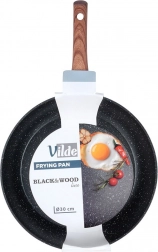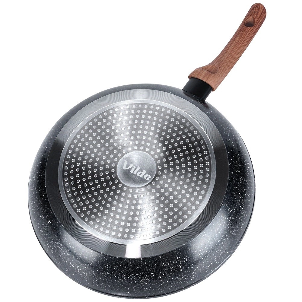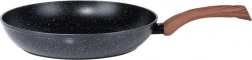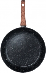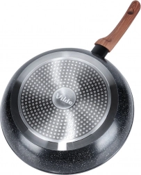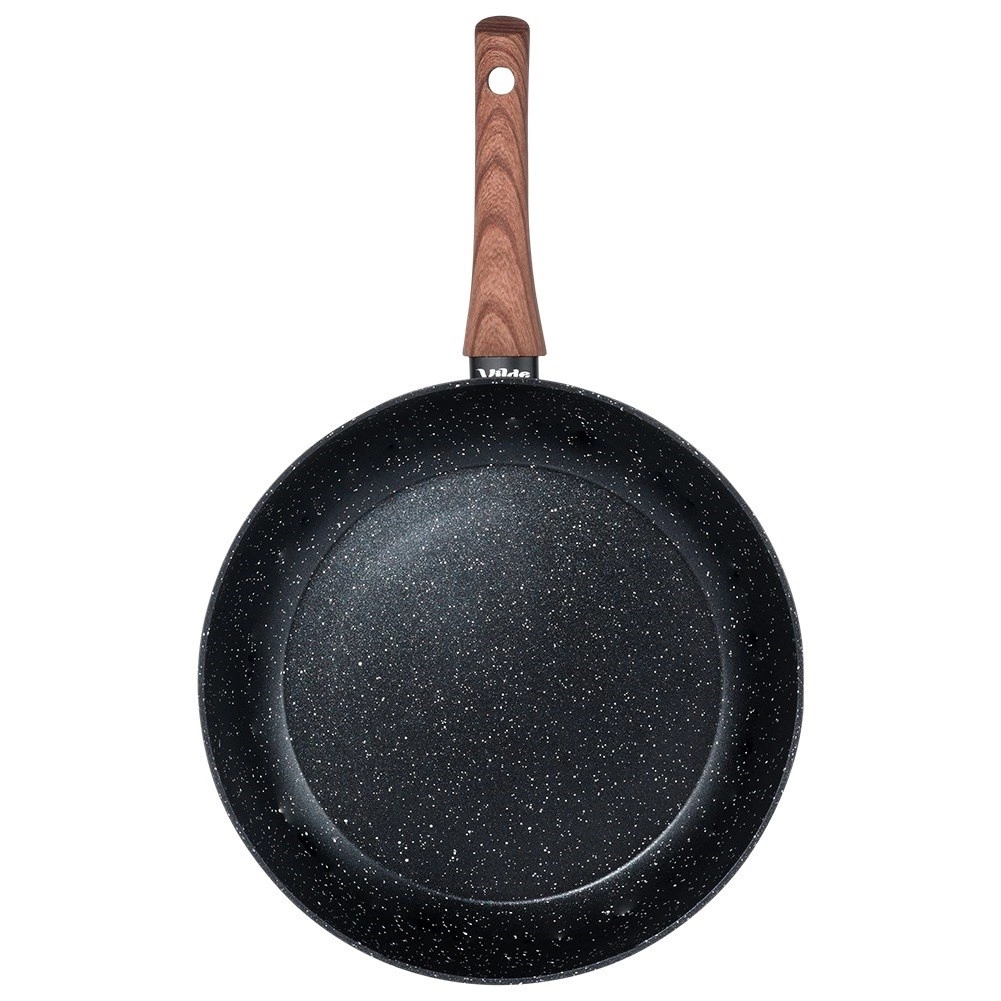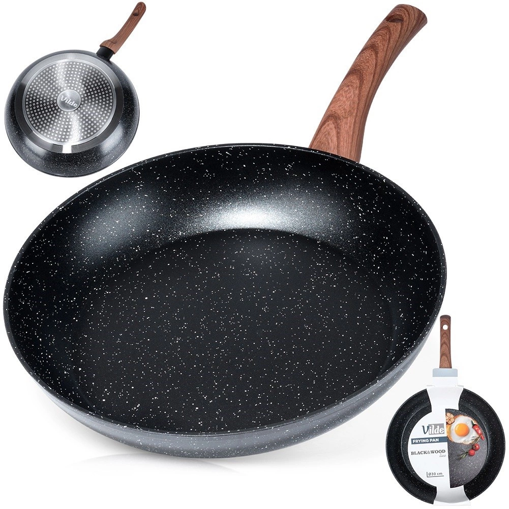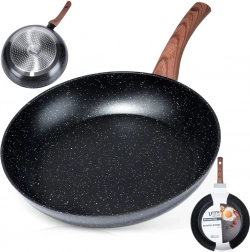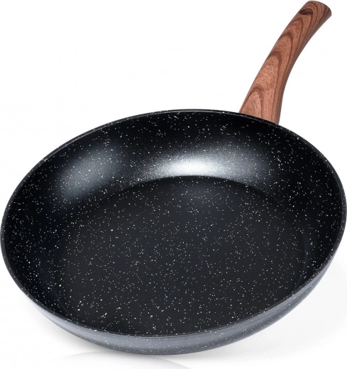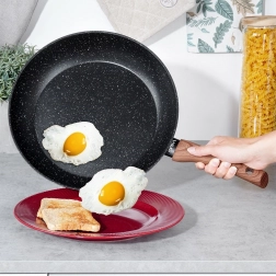 Ta nowoczesna granitowa patelnia w eleganckim połączeniu czerni i drewna ułatwi codzienne gotowanie. Dzięki solidnemu aluminiowemu odlewowi i wielowarstwowej nieprzywierającej powłoce przygotujesz mięso, warzywa i jajka z minimalną ilością oleju i bez przypalania. Płaskie, stabilne dno zapewnia szybkie nagrzewanie i równomierne rozprowadzanie ciepła po całej powierzchni.