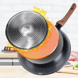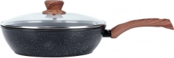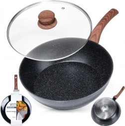 Ta głęboka aluminiowa patelnia z granitową, nieprzywierającą warstwą jest idealna do codziennego gotowania: smażenia, podsmażania i duszenia. Eleganckie połączenie czerni i drewnianego wyglądu świetnie pasuje do nowoczesnej kuchni, a szklana pokrywka pozwala kontrolować potrawę i utrzymuje ciepło oraz wilgoć.