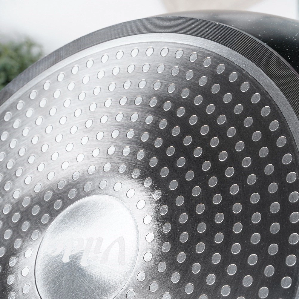 Solidne dno równomiernie rozprowadza ciepło i nadaje się do gazu, elektryki, płyty ceramicznej, halogenu oraz indukcji. Szybko się nagrzewa i oszczędza energię.